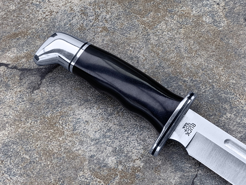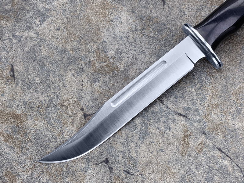 这把0120BKS-B是巴克公司推出的一款加长型狩猎刀,采用420HC不锈钢锻造狭长上曲的回形刀片,微微凹磨的手法让刀具拥有出色的切削性能,针状刀尖又拥有出色的穿刺力。这把加长型刀具除了进行切削外还能用来在危机时刻与凶猛野兽进行贴身格斗,为了保证刀具拥有更好的强度,刀身开有血槽增加性能。巴克推出“公平追逐狩猎”系列是为了提醒猎人们在执行狩猎活动时也不要忘记维护动物生态环境。