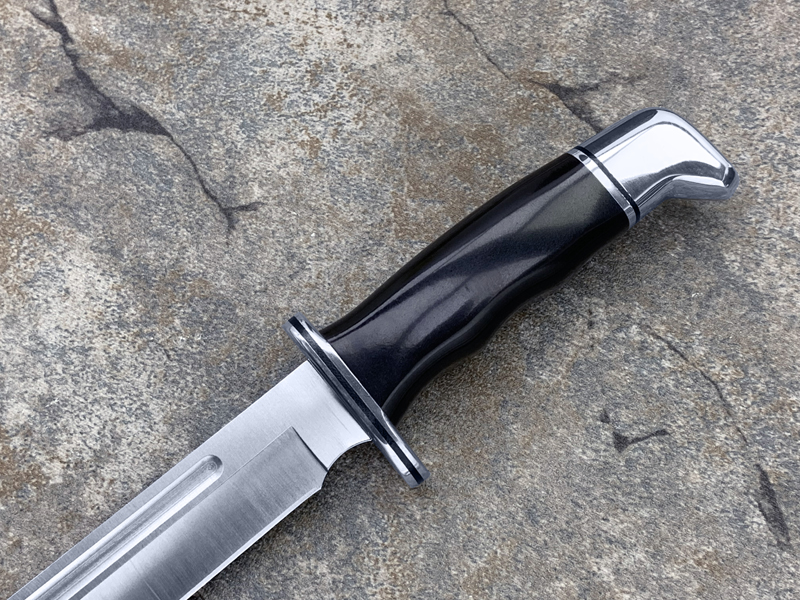 刀柄材质为黑色酚醛树脂,拥有出色的手感和外观表现。刀柄上采用铝材制作护手和尾部圆头,采用抛光技术更加闪亮并保障使用安全。