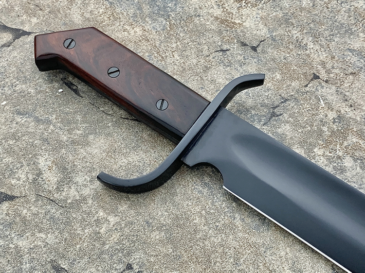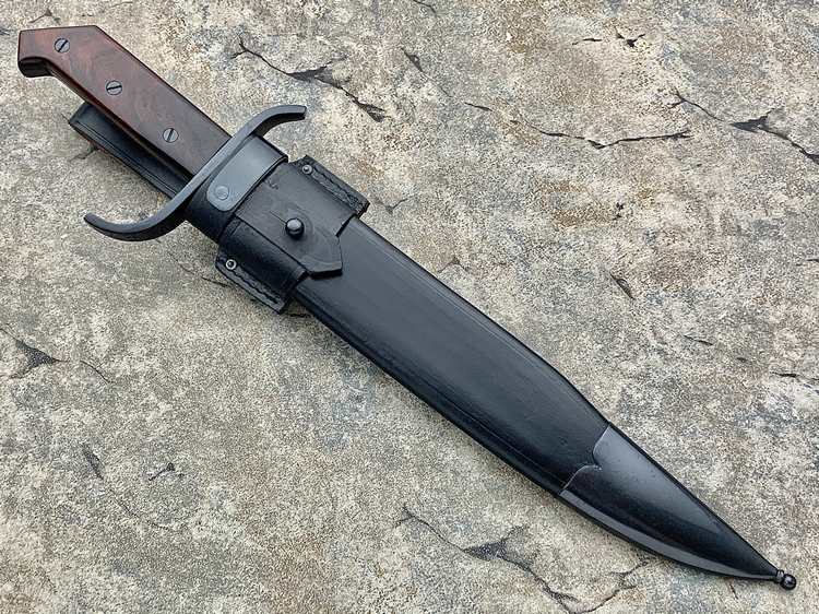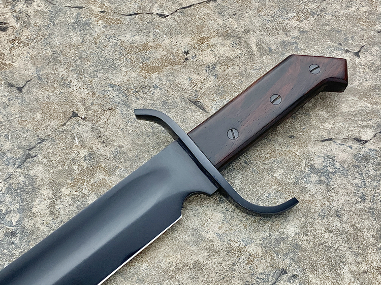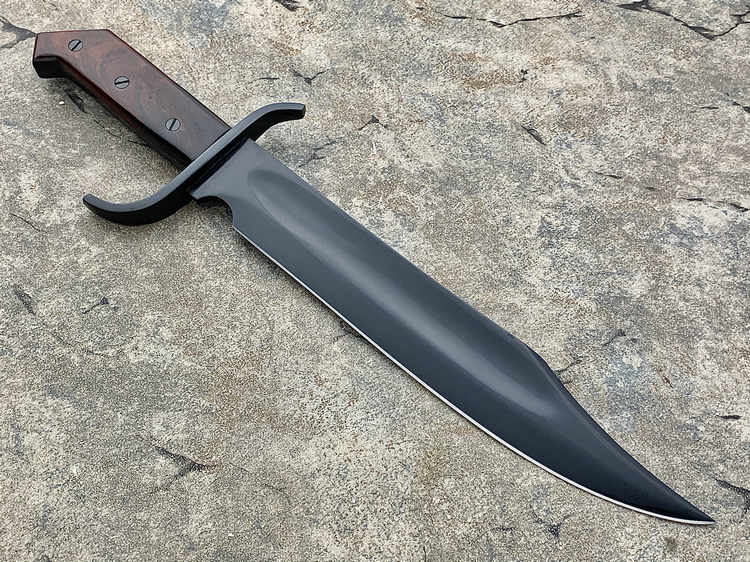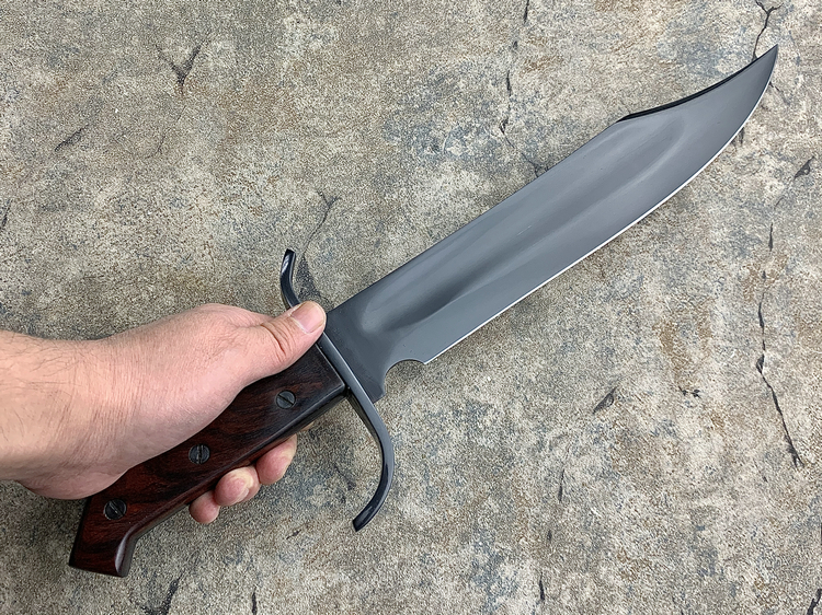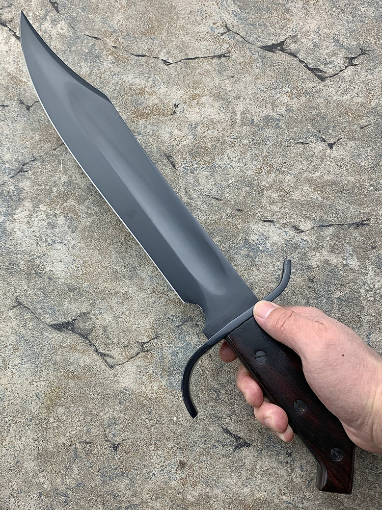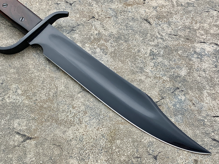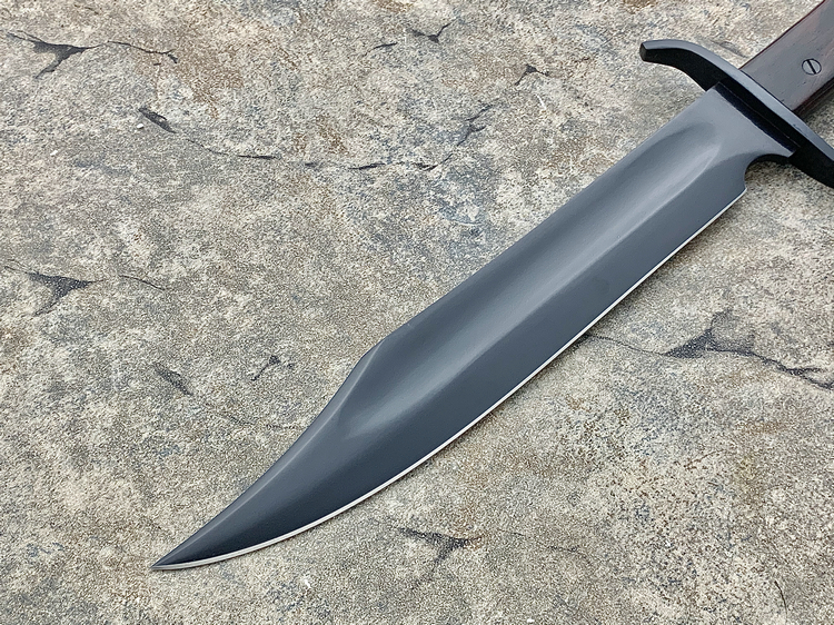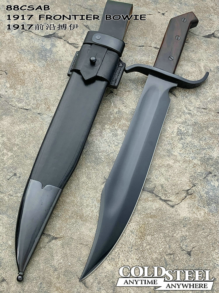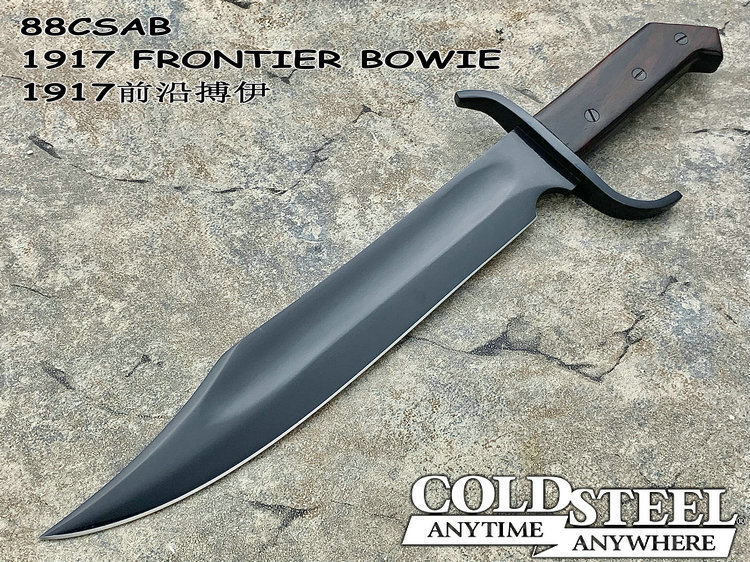 类 型: 直刀 型 号:88CSAB 全 长: 445mm 刃 长: 313mm 刃 材: 1055 Carbon 硬 度: 58-59HRC 表 面: 黑色涂层 刃 厚: 6mm 柄 材: Hardwood 重 量: 731g 原产地: 印度 刃 鞘: 皮鞘 From its huge imposing blade to its handsome rosewood handle, every inch of our Frontier Bowie screams perfection! Almost sword-like in its cutting and thrusting performance, the Frontier Bowie features a wide, wickedly keen hand-sharpened blade with a generous clip and huge fuller. Made from 1055 Carbon Steel, it is heat treated to a hard spring temper and beautifully blued to a lustrous finish. Its blade is both long and stiff enough to oppose even much larger weapons, while wide and sharp enough to make the most of every opportunity to cut, thrust and deliver a "palpable hit". The Frontier Bowies handle is a perfect accompaniment to its battle-ready blade. Its big "S" shaped guard offers excellent hand protection while the slim, flat profile stops it from twisting in your hand and keeps your edge alignment true even in the heat of combat. Its modified pistol grip also keeps the knife locked safely in your hand even when utilizing a palm reinforced grip for extended reach and leverage in the thrust. To further compliment this exceptional knife, we have created a high quality leather sheath with a blued steel throat and chape. Its swiveling leather belt frog is wide enough to accommodate even a thick military belt and fully detachable to allow you to slide the knife into your belt for a more traditional carry. This versatile knife is suitable for historical re-enactment groups from the 1830’s onwards, Cowboy Action Shooters, civil war re-enactors and even modern Military groups. This truly battle ready blade is ready for any adventure, so whatever your Frontier, make sure that you have a Cold Steel Frontier Bowie by your side!