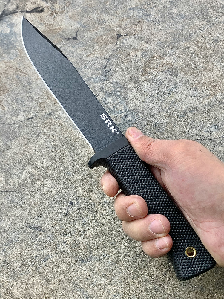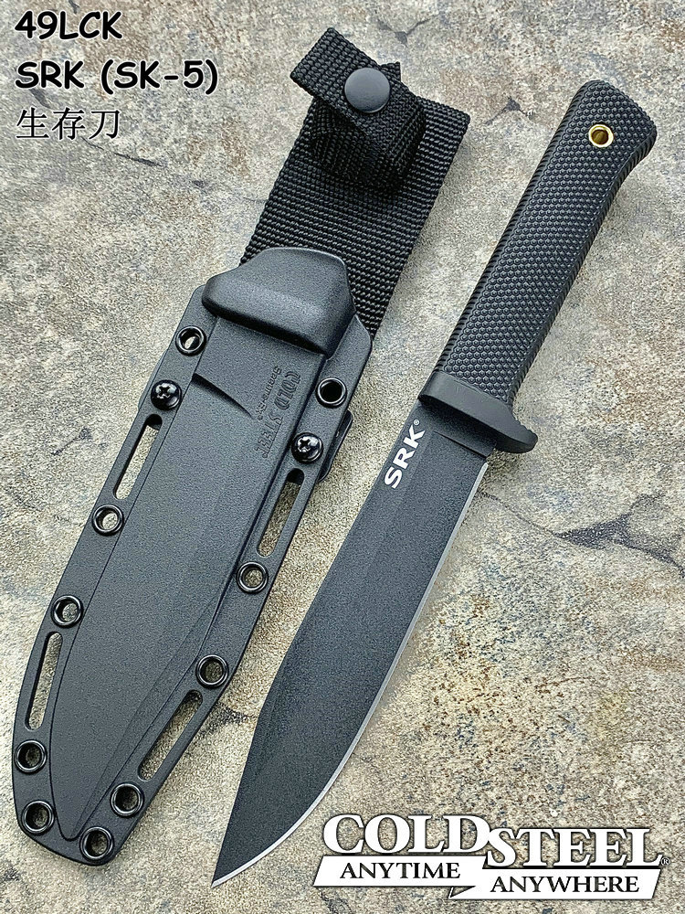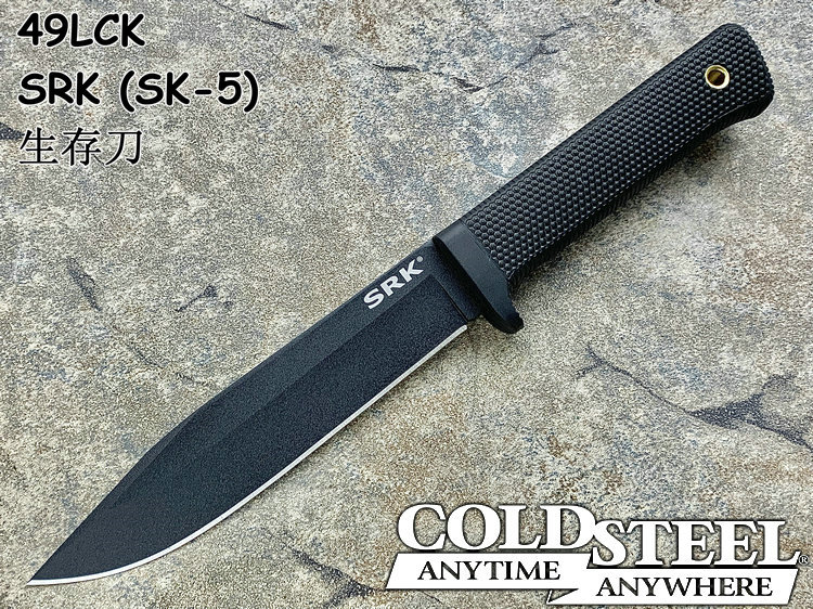 SRK即 ”Survival Rescue Knife”的缩写,中文意思为「求生救援刀」。Cold Steel的刀匠认为,一把用作求生救援的刀子,必须具有高水平的性能,才能在不良的环境中应付紧急状况〞争取关键的一分一秒。为达到这个标准,Cold Steel将重点集中在钢材的炼制、热处理过程,以及打磨的工夫上,不以外表取胜,不哗众取宠。生存/救援行动需要一种通用的刀以应付极端的情况。冷钢SRK就是按此用途设计的。