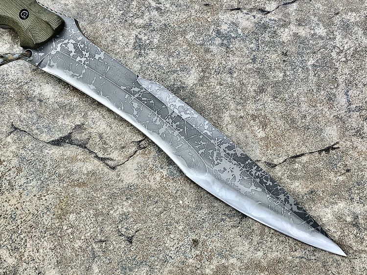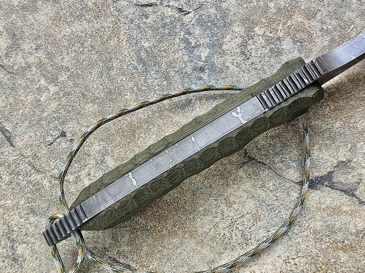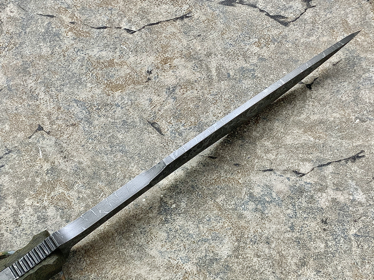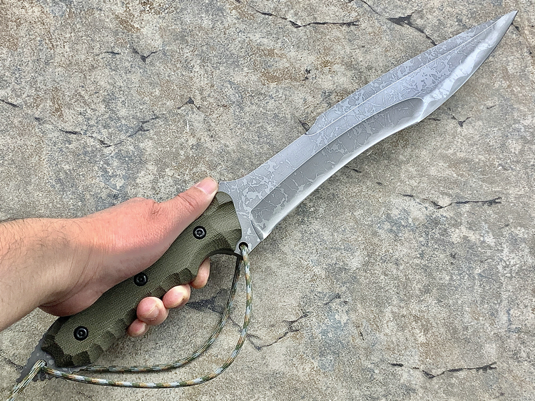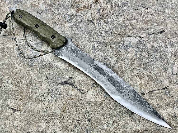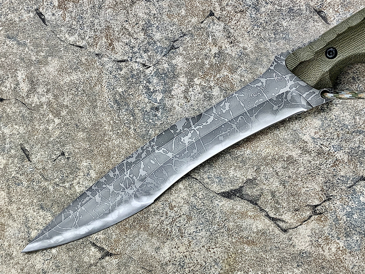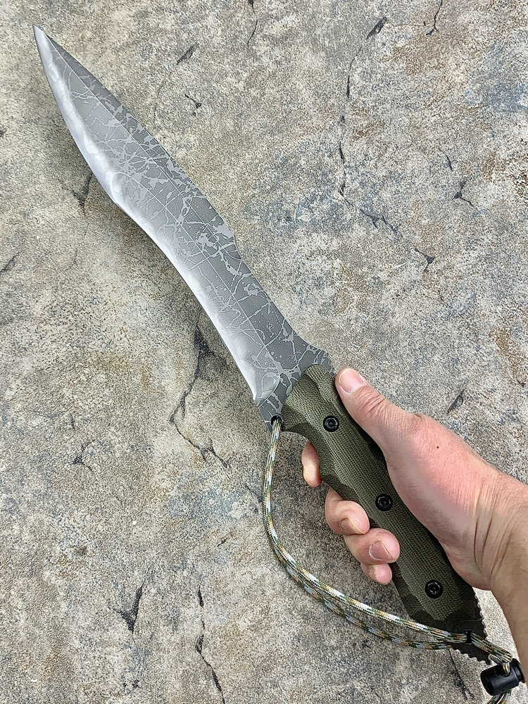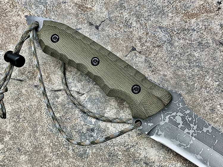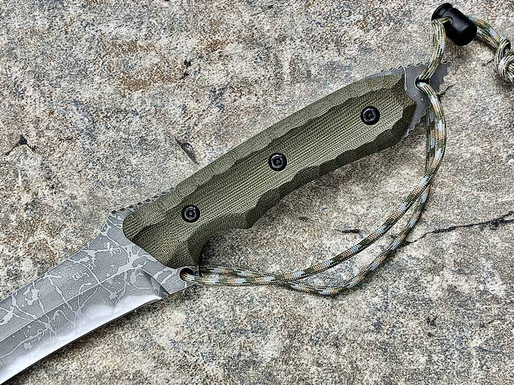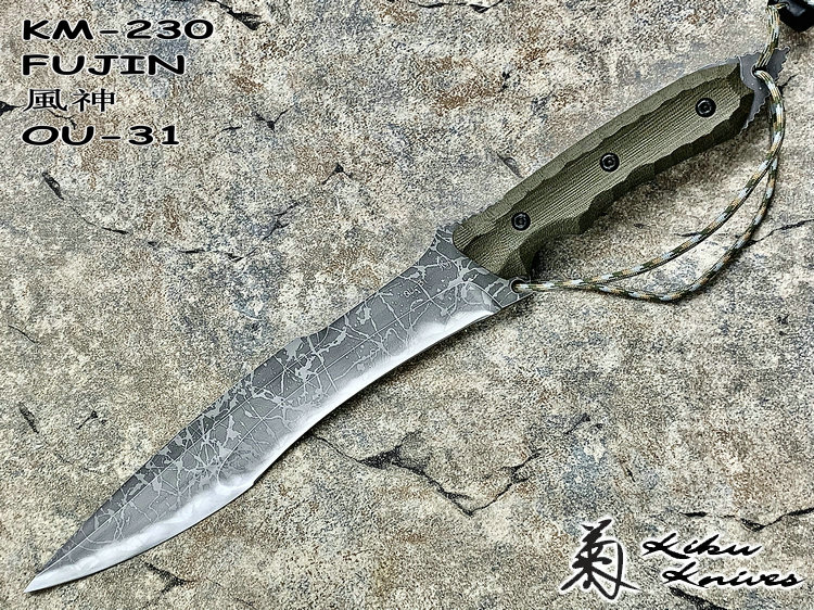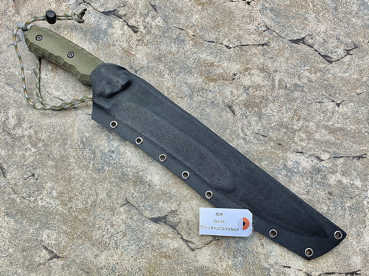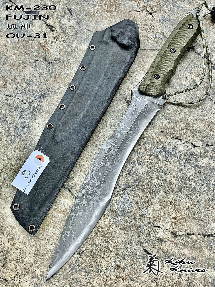 全长:474mm 刃长:293mm 刃厚:10mm 刃材:OU-31 硬度:62HRC 柄材:米卡塔 重量:1091g含鞘1222g 原产地:日本 松田菊男制作的这把FUJIN,是菊男最著名的Full Contact重型系列中最大的一款作品,这是与 KM-170 Raijin匹配的作品。Fujin是掌管风的神灵,而Raijin则是掌管雷电的神明。这把超大规格的刀具由OU-31钢材制作,多研磨面刀身上采用V磨和凸磨相间的手法进行打磨,刀背侧则打磨成菊男一惯的假刃,增加了刀具的贯穿性能。超长的背部拇指凹槽,可以让使用者更好的把握刀具。手波状外形的帆布米卡塔手柄上,拥有固定伞绳的孔洞,即使在粗用过程中也能保障刀具处于控制之内。而纯金属材质的柄部可以更好的发挥破碎器和击锤的作用。