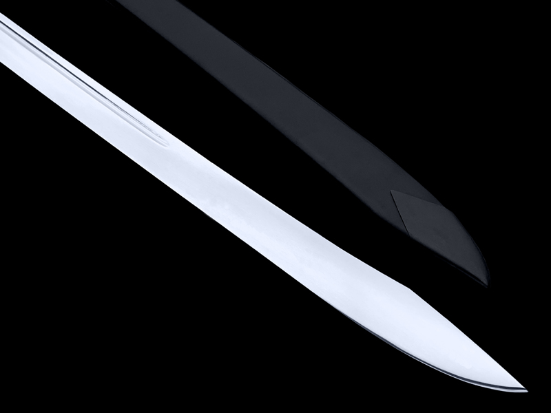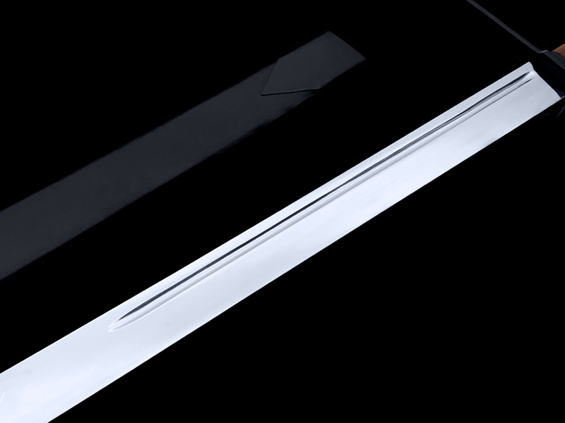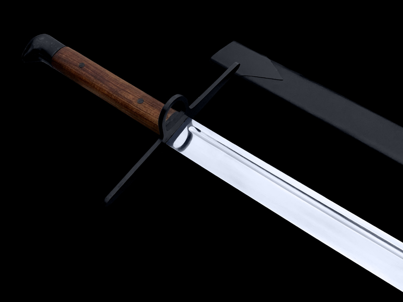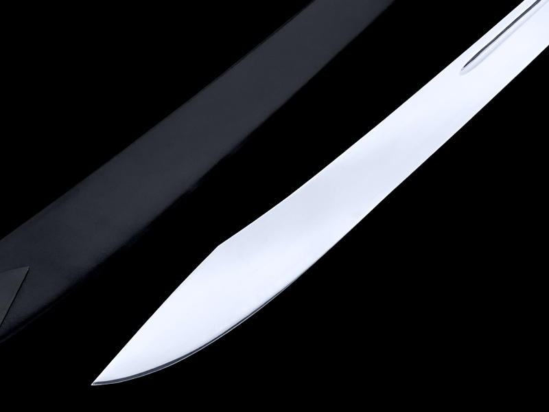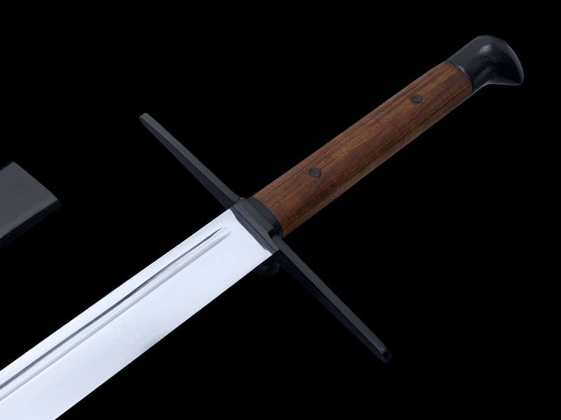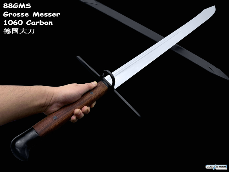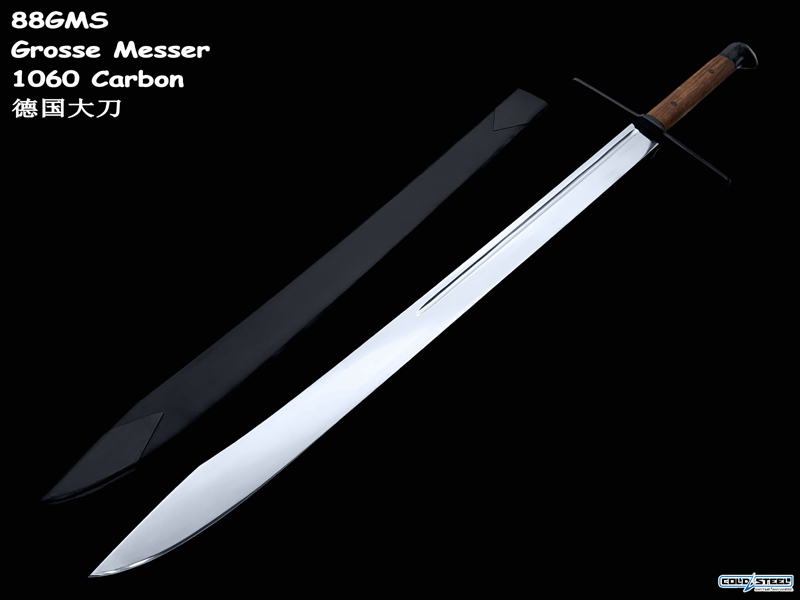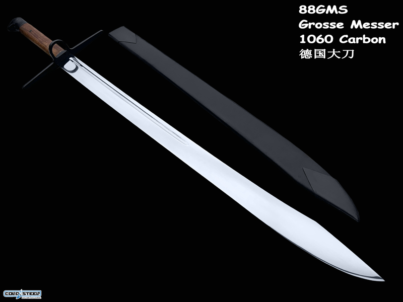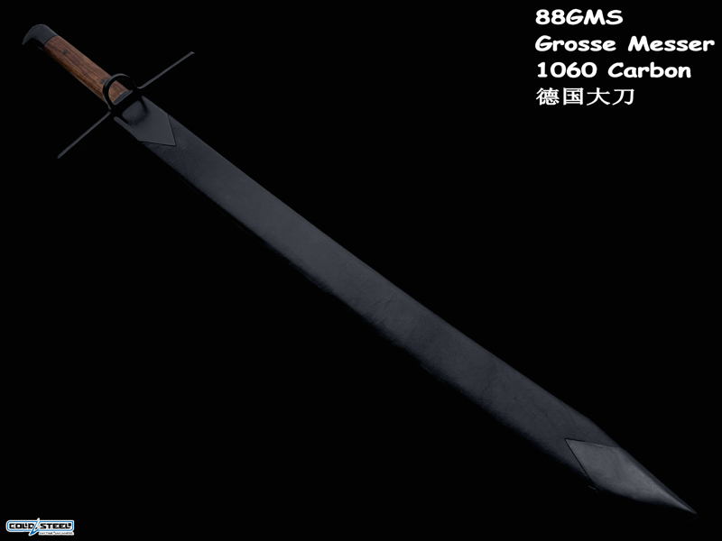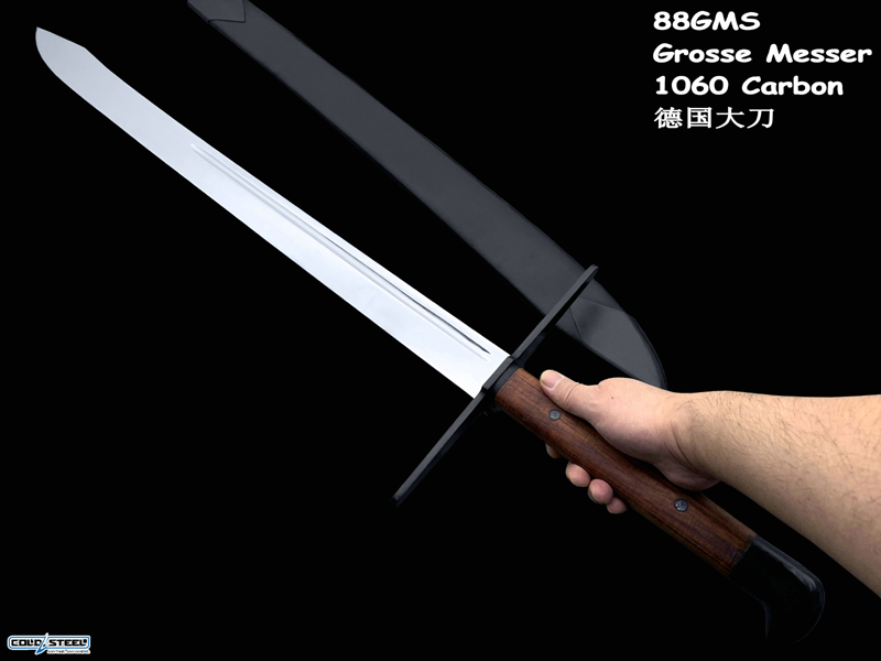 型 号: 88GMS 全 长: 1077mm 刃 长: 813mm 硬 度: 56-58HRC 刃 材: 1060 Carbon 表 面: 拉丝 刃 厚: 5mm 重 量: 1727g 柄 材: 红木 刀 鞘:羊皮鞘 Known throughout Germany as the "Big Knife", the Grosse Messer hails from central and northern Europe where, in far off days of old, noblemen and peasants alike relied on it to protect hearth and home from the ravages of brigands, cut throats, outlaws and other assorted characters of ill repute. Due to its stout, wide blade and generously sized handle, it could be wielded in one or both hands and was capable of shearing through chain mail or cutting a man in half with a single strike. Our version of this elegantly simple yet remarkably effective weapon sports a hand forged blade of 1055 Carbon steel that's so sharp we have used it to split a telephone book in half, with a single blow! The guard and heavy pommel are made from blued steel and feature rosewood handle scales riveted to the sword's full tang. For convenience and safety, the Grosse Messer comes with a strong, handsome scabbard crafted from wood and covered in black leather. It is reinforced with a steel chape and throat that has been blued to match the guard and pommel.