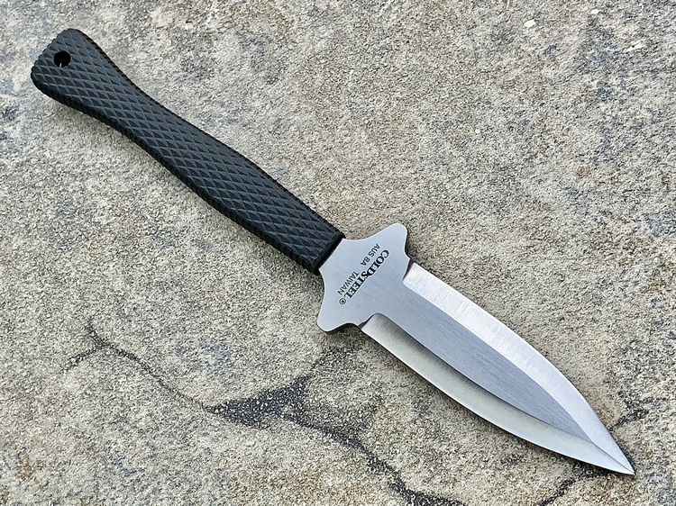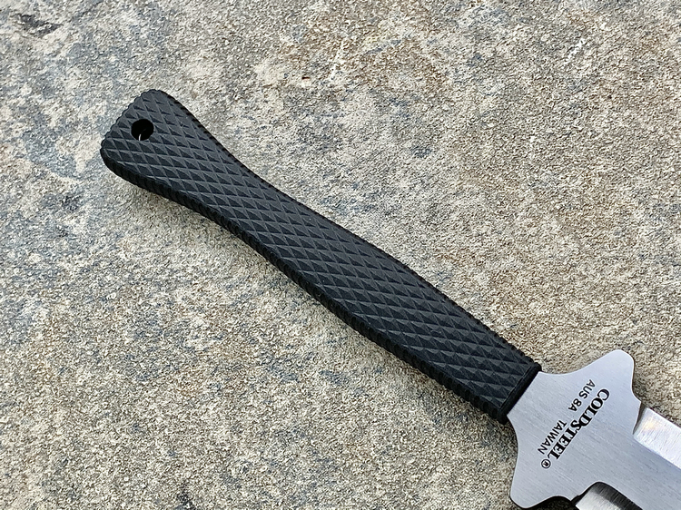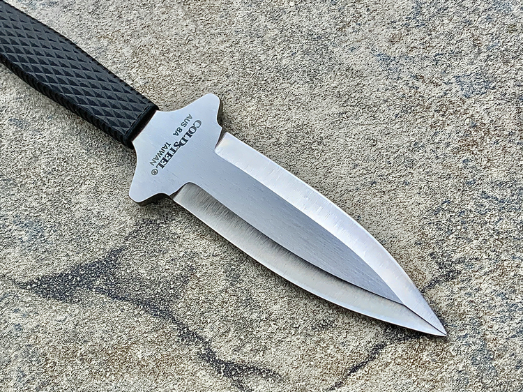 刀身采用日式AUS 8A不锈钢锻造,双刃刀身采用斯坎迪亚(Scandi)式研磨手法,这使得刀尖部分非常尖锐也非常强壮,这使得产品拥有强大的穿透力。两侧刀锋精心研磨后拥有出色的切削能力,并在刀尖破入目标后撕开两侧让刀具可以更深入。刀身表面采用高抛光缎面研磨,并在两侧印刻冷钢标志和型号信息。