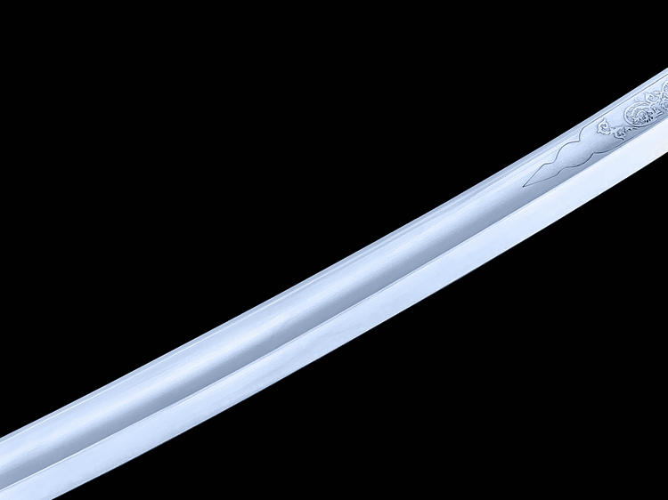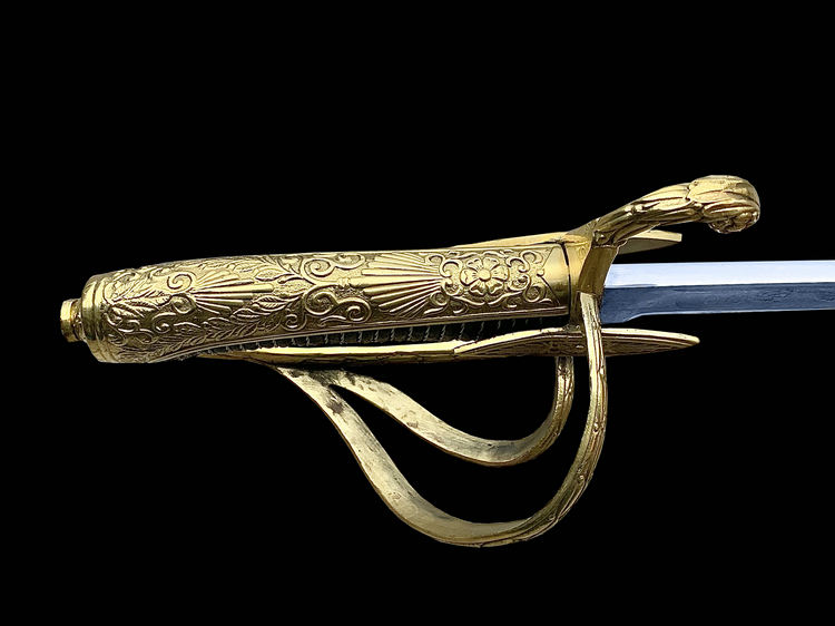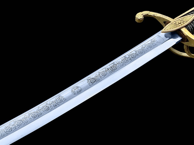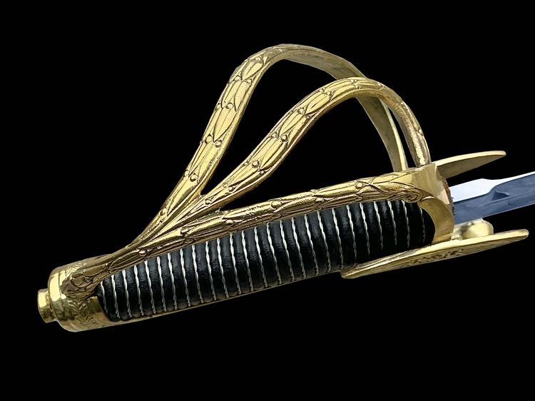 It was beautifully balanced and offered a moderately curved blade, a sharp useful point, and an excellent three bar hilt. As a cavalry weapon, it was more than suitable for use in a charge and performed equally well when fighting at close range in the m阬閑. It was, however, the striking appearance of this saber that really inspired us. From the highly polished steel and elegant etching on the blade, to the intricately decorated solid brass furniture and hilt, it's truly a vision to behold.