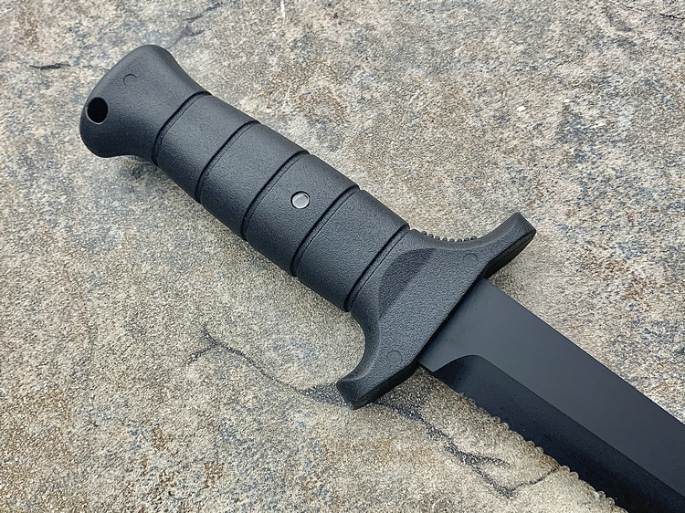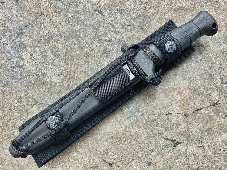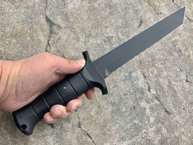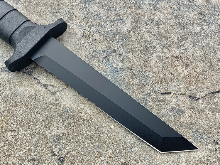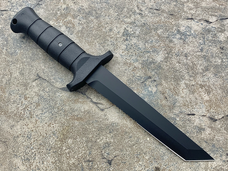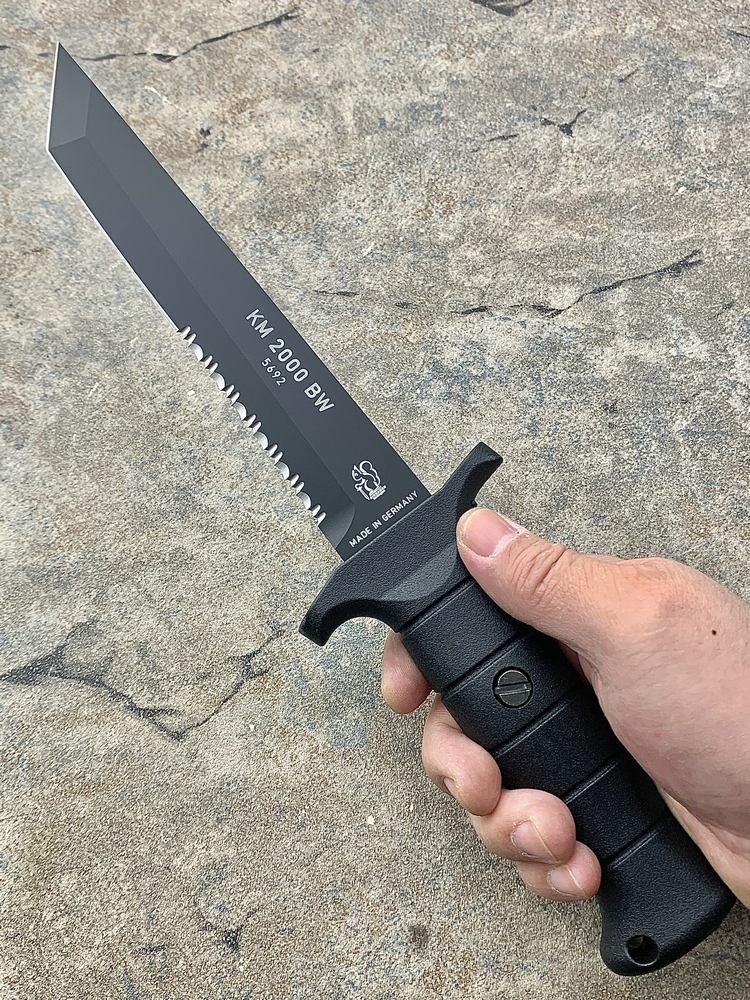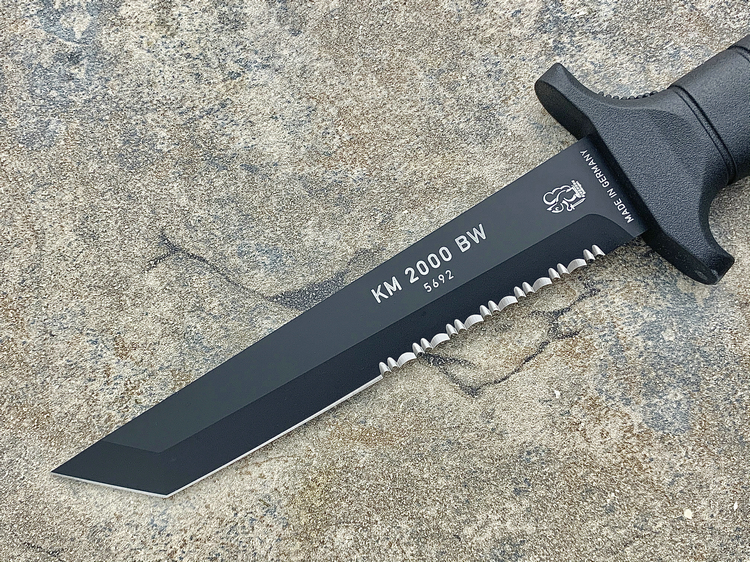 KM2000是在KM2000BW基础上的升级版,无论加工工艺和质量都有所提高.最初使用的440a钢被N695钢代替( HRC57-59)是更可靠和有效的保证.新开发的多锋刀刃结构再次提高了刀刃的承载力.kalgard涂层一体式刀片贯穿整个玻璃纤维工程塑料手柄可以很容易击碎玻璃.鞘设计适合所有美国、德国战术背心及裝具.鞘配有固定钻石磨刀器.