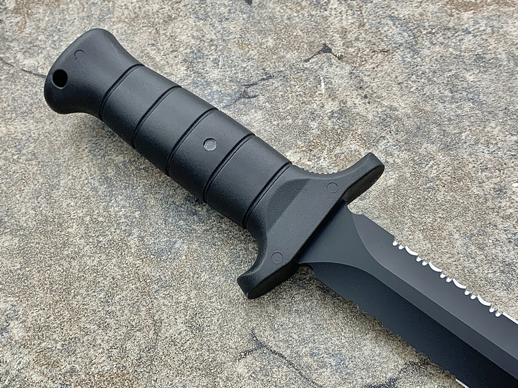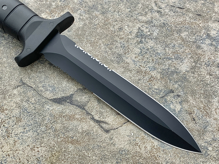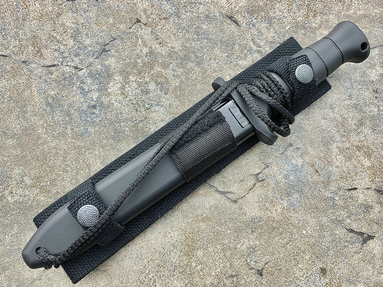 kalgard抗磨损黑色涂层,并设计半锯齿刃刃.kalgard涂层一体式刀片贯穿整个玻璃纤维工程塑料手柄可以很容易击碎玻璃,刀鞘设计适合所有美国、德国战术背心及装具.