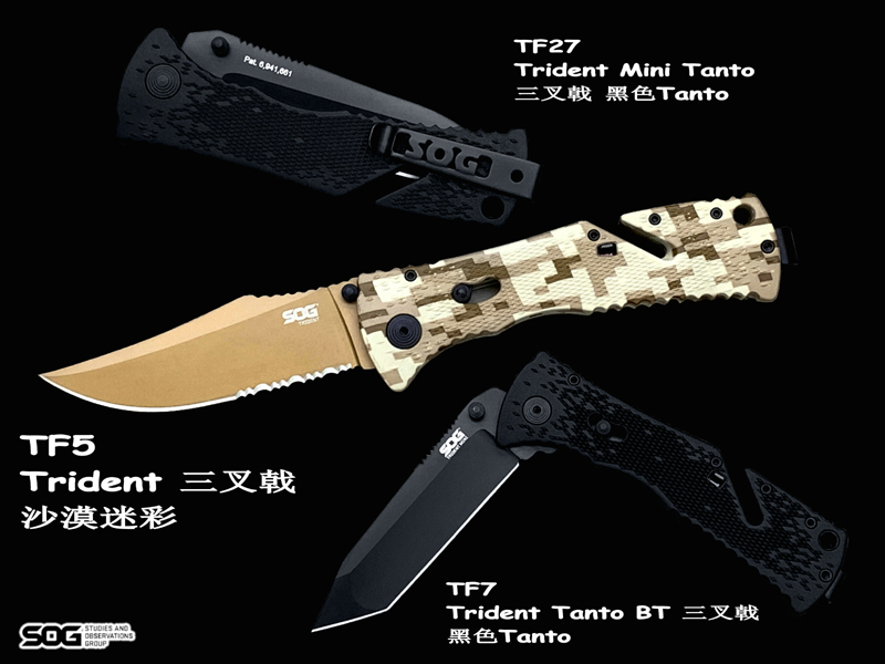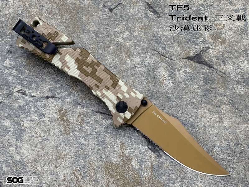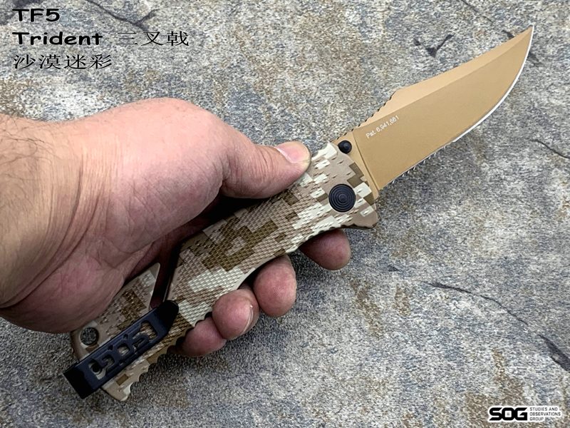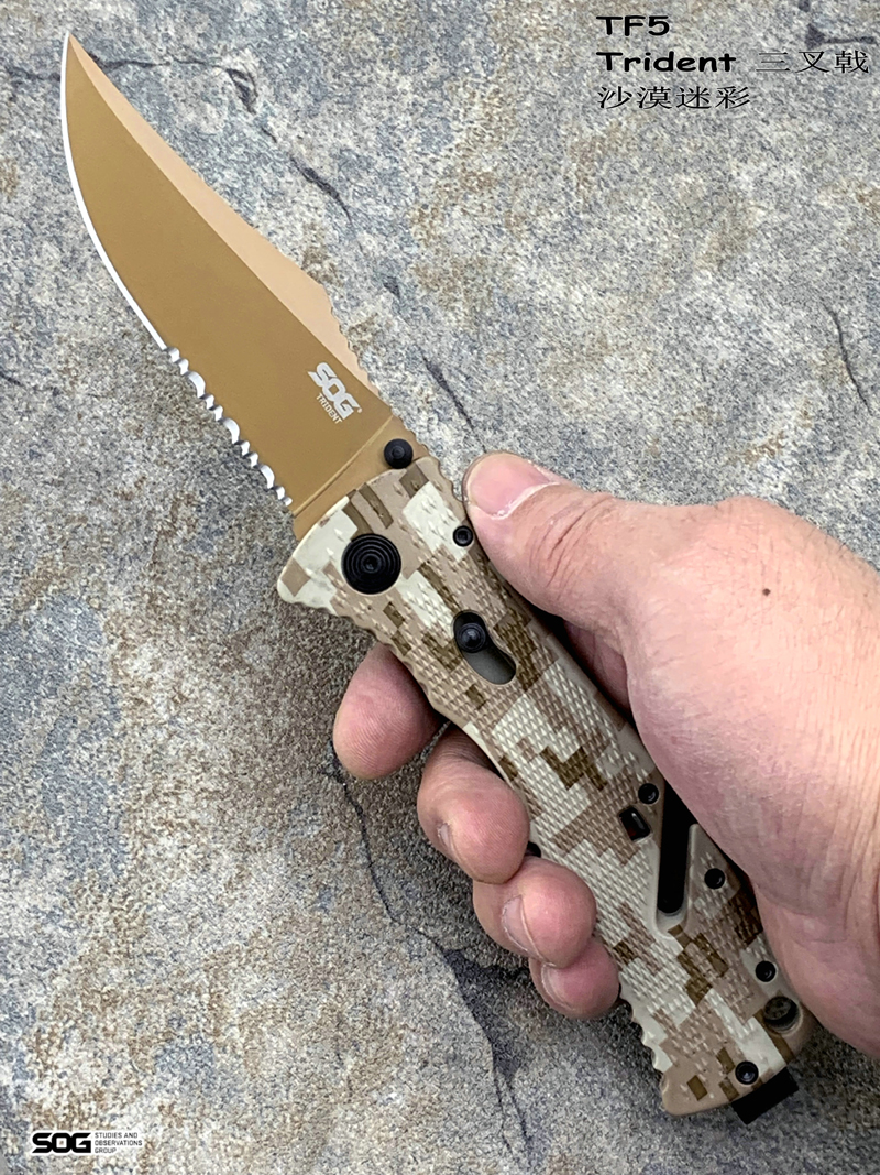 产 地: 美国 SOG三叉戟闪电战术折刀由首席工程师Spencer Frazer设计,结合采用S.A.T专利(SOG 协助技术)。使刀具开启速度更为迅捷,为你争得分分秒秒机遇。使用时轻推刀刃助力钮,尖锐的刀刃瞬间侧弹而出,高高昂起。刀头采用了类似AK军刺的刨削刀尖(Clip Point)设计。刀背曲线往下与刀尖相接,两线夹角自然生成锐利刀尖。有类似剑尖一般的刺戳能力,且有相当优良的砍劈效果。刀刃涂层采用优良的钛氮化合物覆盖保护,能完全消除反光并长久保持刀刃锋利。此外,SOG三叉戟闪电战术折刀有着良好的抓握能力。握持刀柄时您的大拇指、食指及无名指受力处皆有厚厚的齿状防滑纹,极好的承接手掌对刀具的压力,防止刀柄的偏移。配合其经典的轴锁保持刀刃弹启后纹丝不动,非一般的牢固。刀柄上亮眼的特色豁口切割设计是它的一大特色。使刀具即使在合拢时也可随时发挥功能,麻利的切割绳索及安全带。使您脱离险境。为预防在长期颠簸的行军途中刀具意外磕碰弹射打开,刀柄还附加刀具安全锁。在保存刀具时候将红色安全锁关上(拨向刀刃一侧即可),刀具就是在人为磕碰下都很安静、安全。牢牢的合拢在刀柄内待命。随刀配备有精制的可左右换装的“SOG”镂刻刀夹。方便更多朋友来携带它,使用它。来更好的体验SOG三叉戟快速战术折刀的魅力。