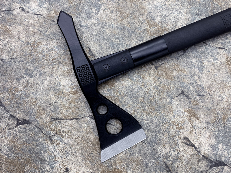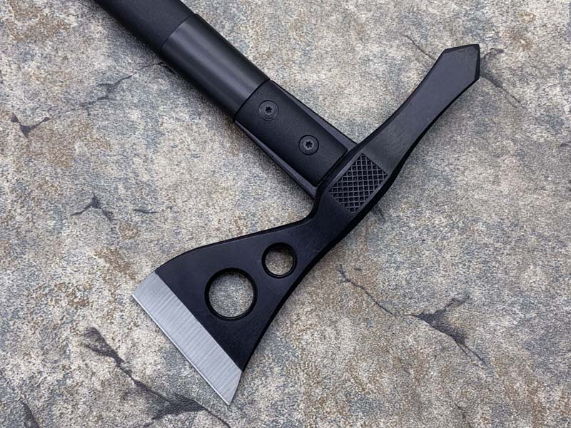 斧刃以平磨方式开刃锋利且保证其坚固性,斧面上设计有两个大小不一的圆形减压孔,减轻重量增加外观美感。另一侧的福鼎部位呈现矛尖状穿刺性能比主刃还要强悍。