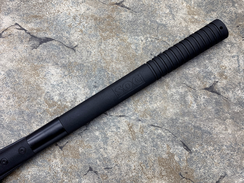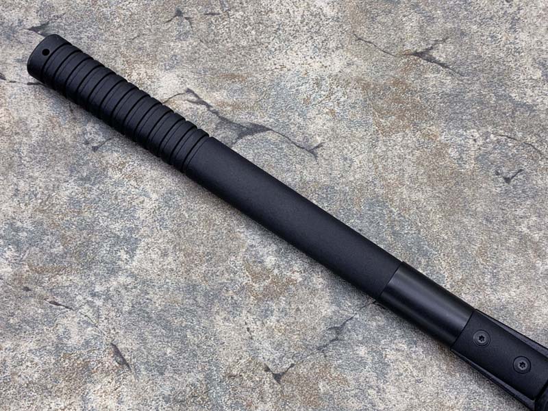 斧头与斧柄采用两枚重型螺栓连接。以钢质套圈加以稳固,大力劈砍也不会松动。
