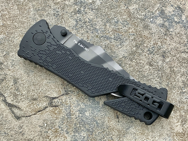 SOG三叉戟闪电战术折刀由首席工程师Spencer Frazer设计,结合采用S.A.T专利(SOG 协助技术)。使刀具开启速度更为迅捷,为你争得分分秒秒机遇。使用时轻推刀刃助力钮,尖锐的刀刃瞬间侧弹而出,高高昂起。刀头采用了类似AK军刺的刨削刀尖(Clip Point)设计。刀背曲线往下与刀尖相接,两线夹角自然生成锐利刀尖。有类似剑尖一般的刺戳能力,且有相当优良的砍劈效果。刀刃涂层采用优良的钛氮化合物覆盖保护,能完全消除反光并长久保持刀刃锋利。此外,SOG三叉戟闪电战术折刀有着良好的抓握能力。握持刀柄时您的大拇指、食指及无名指受力处皆有厚厚的齿状防滑纹,极好的承接手掌对刀具的压力,防止刀柄的偏移。配合其经典的轴锁保持刀刃弹启后纹丝不动,非一般的牢固。刀柄上亮眼的特色豁口切割设计是它的一大特色。使刀具即使在合拢时也可随时发挥功能,麻利的切割绳索及安全带。使您脱离险境。为预防在长期颠簸的行军途中刀具意外磕碰弹射打开,刀柄还附加刀具安全锁。在保存刀具时候将红色安全锁关上(拨向刀刃一侧即可),刀具就是在人为磕碰下都很安静、安全。牢牢的合拢在刀柄内待命。随刀配备有精制的可左右换装的“SOG”镂刻背夹。方便更多朋友来携带它,使用它。来更好的体验SOG三叉戟快速战术折刀的魅力。