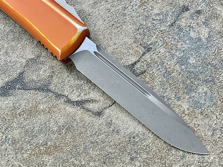 手柄由航空级6061-T6铝合金制成,以增加刀具的强度,并达到减轻重量的效果。 这款跳刀,微技术将它的手柄表面做了橘色战损做旧处理,有着十足的美感。 此外,微技术将它的手柄和推钮进行了纹理化设计,增强了使用时的牵引力与抓握力。 推刀钮的设计非常细心实用,推刀钮上有个大大的X图案设计,大拇指在推刀时,止滑力很强。 手柄上两侧有横向凹槽纹理,这也是为了增强抓握时的止滑力与牵引力,使之不易脱手。