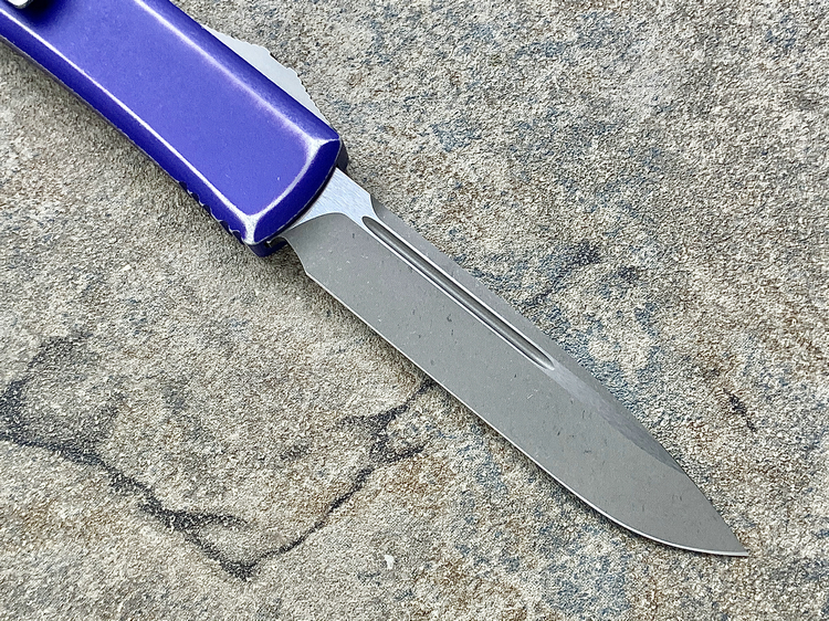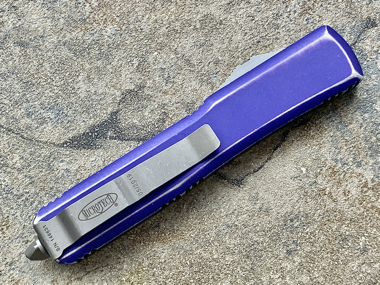 手柄由航空级6061-T6铝合金制成,以增加刀具的强度,并达到减轻重量的效果。 这款跳刀,微技术将它的手柄表面做了紫色战损做旧处理,有着十足的美感。 此外,微技术将它的手柄和推钮进行了纹理化设计,增强了使用时的牵引力与抓握力。 推刀钮的设计非常细心实用,推刀钮上有个大大的X图案设计,大拇指在推刀时,止滑力很强。 手柄上两侧有横向凹槽纹理,这也是为了增强抓握时的止滑力与牵引力,使之不易脱手。