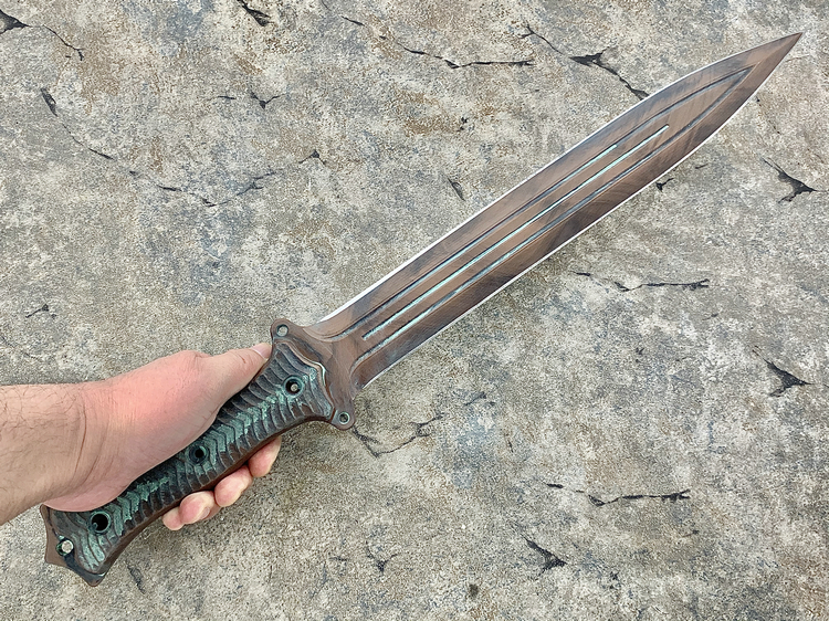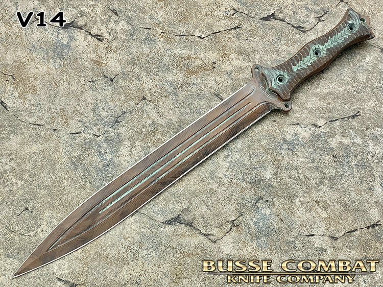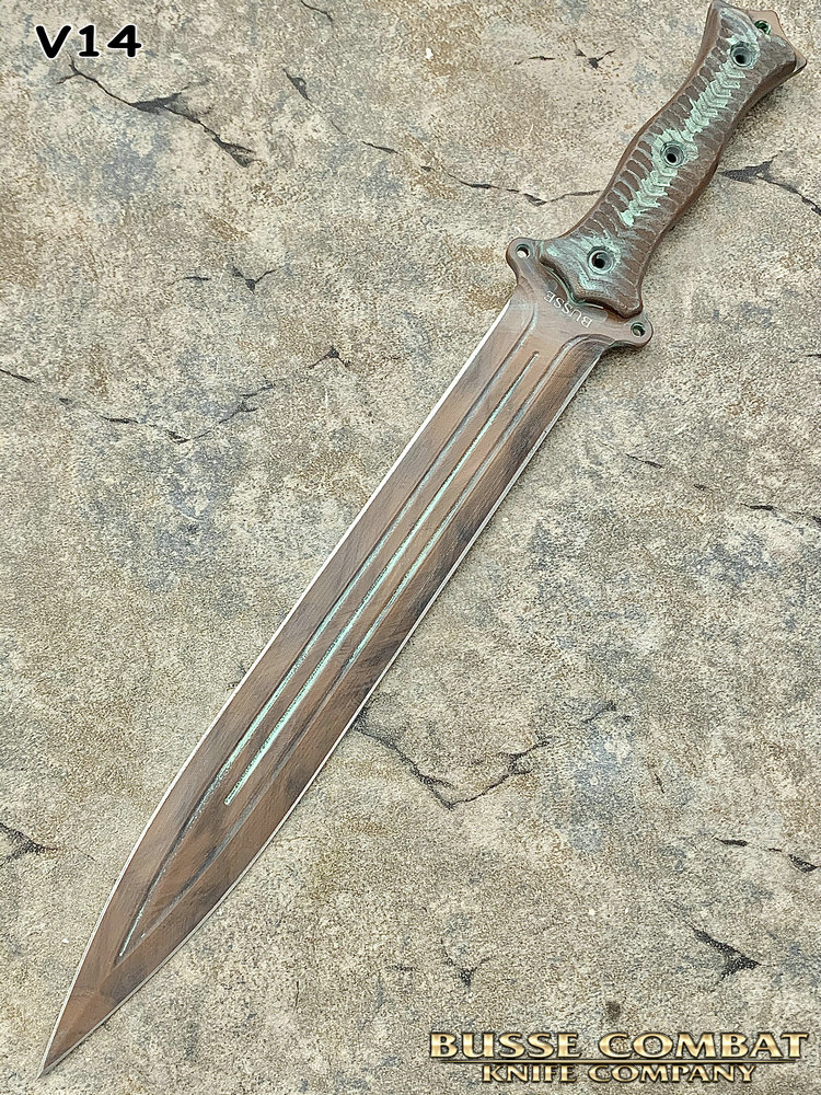 V14是为严酷的重型战斗而设计。其特点是采用Busse的专利波纹斜角技术的14英寸刀身。到目前为止,这种设计是匕首世界里“最疯狂的设计”,线条流畅自如,即使静止不动,V14看起来也在运动。