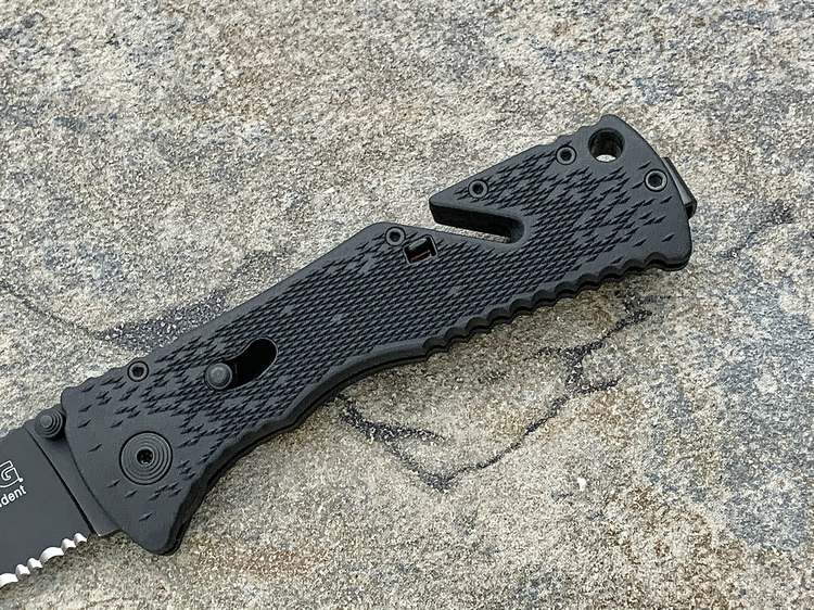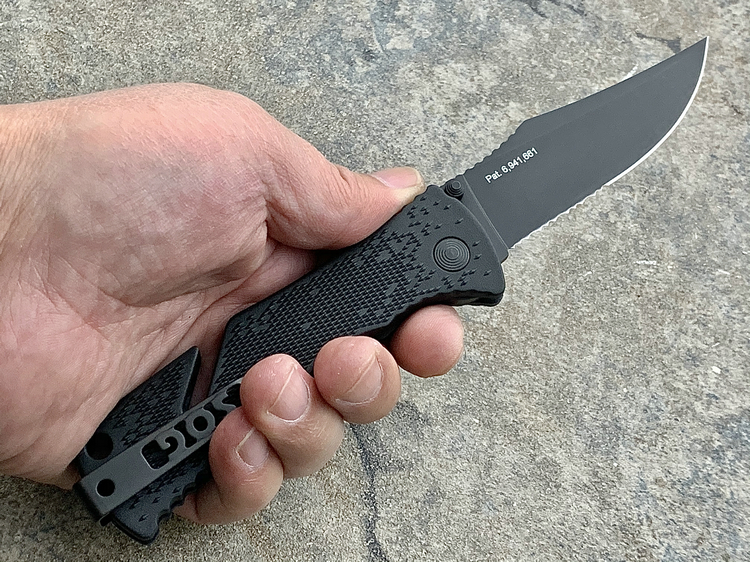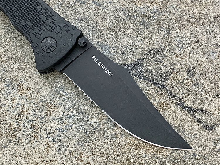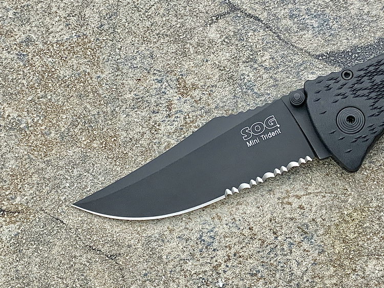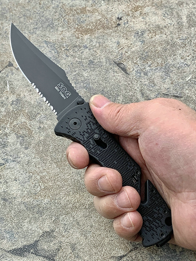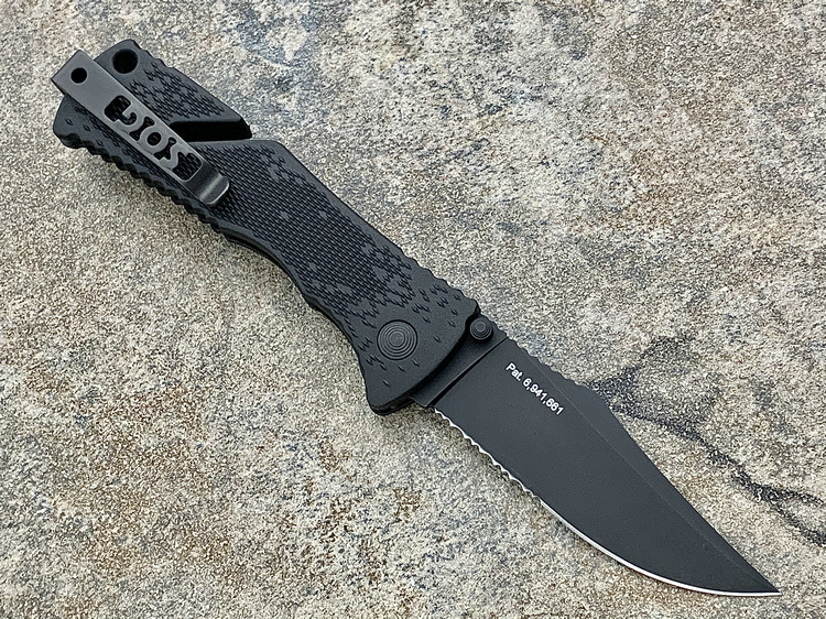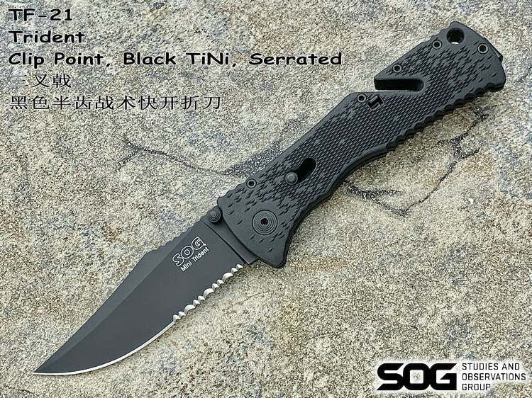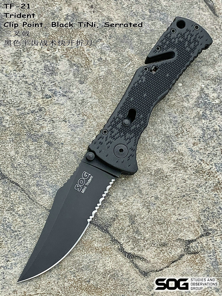 SOG三叉戟闪电战术折刀由首席工程师Spencer Frazer设计,结合采用S.A.T专利(SOG 协助技术)。使刀具开启速度更为迅捷,为你争得分分秒秒机遇。使用时轻推刀刃助力钮,尖锐的刀刃瞬间侧弹而出,高高昂起。刀头采用了类似AK军刺的刨削刀尖(Clip Point)设计。刀背曲线往下与刀尖相接,两线夹角自然生成锐利刀尖。有类似剑尖一般的刺戳能力,且有相当优良的砍劈效果。刀刃涂层采用优良的钛氮化合物覆盖保护,能完全消除反光并长久保持刀刃锋利。此外,SOG三叉戟闪电战术折刀有着良好的抓握能力。握持刀柄时您的大拇指、食指及无名指受力处皆有厚厚的齿状防滑纹,极好的承接手掌对刀具的压力,防止刀柄的偏移。配合其经典的轴锁保持刀刃弹启后纹丝不动,非一般的牢固。刀柄上亮眼的特色豁口切割设计是它的一大特色。使刀具即使在合拢时也可随时发挥功能,麻利的切割绳索及安全带。使您脱离险境。为预防在长期颠簸的行军途中刀具意外磕碰弹射打开,刀柄还附加刀具安全锁。在保存刀具时候将红色安全锁关上(拨向刀刃一侧即可),刀具就是在人为磕碰下都很安静、安全。牢牢的合拢在刀柄内待命。随刀配备有精制的可左右换装的“SOG”镂刻背夹。方便更多朋友来携带它,使用它。来更好的体验SOG三叉戟快速战术折刀的魅力。