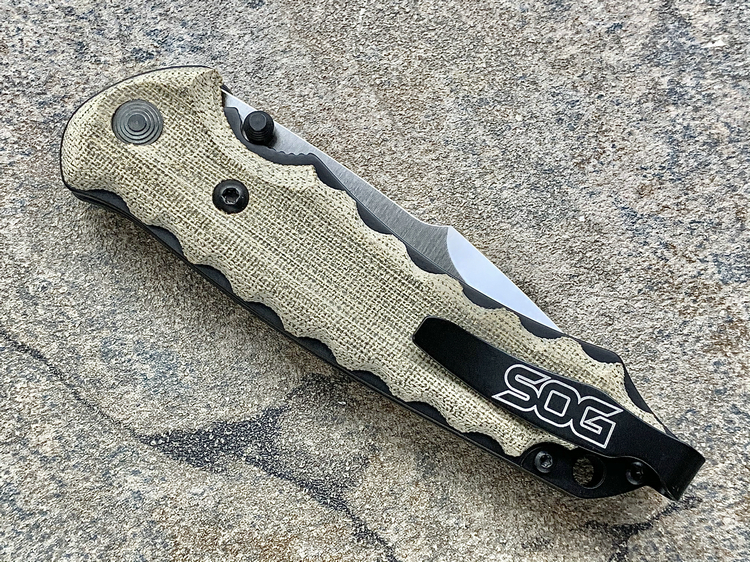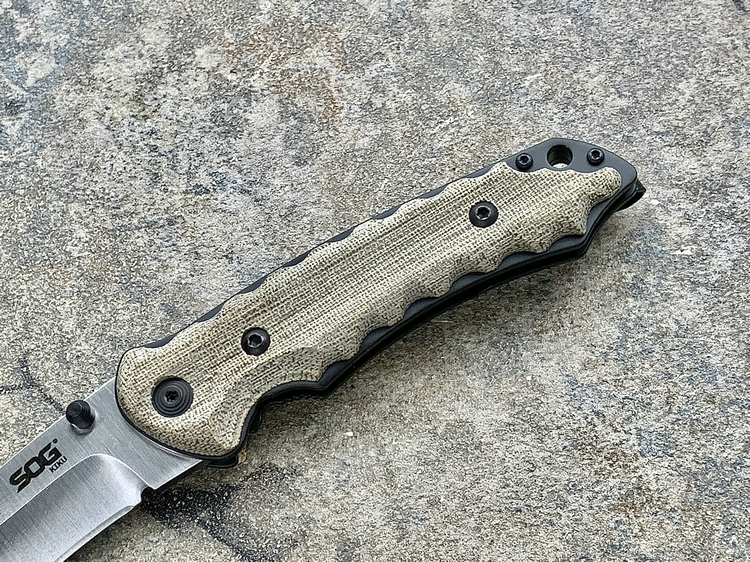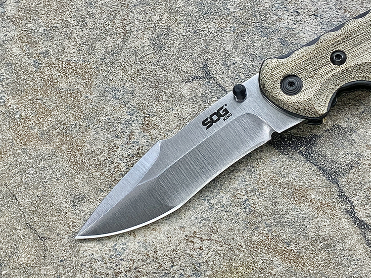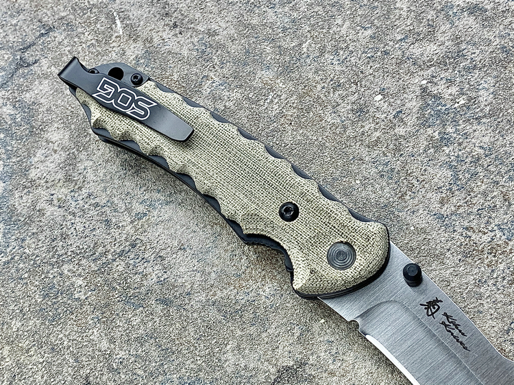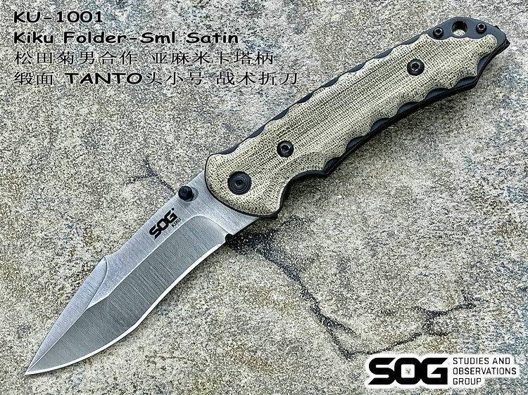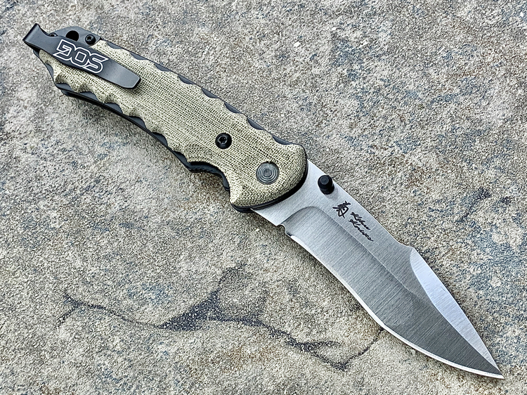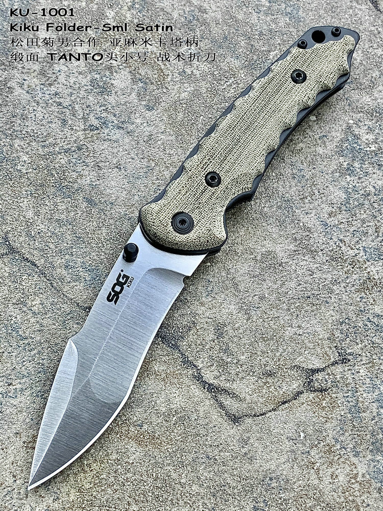 SOG与著名刀匠松田菊男合作第一款折刀,由菊男设计的独特TANTO头刀型在注重切割与穿刺能力的同时在刀头部位增强了一道刀筋这大大增强了刀身的整体强度,亚麻米卡塔刀柄不论我们是戴手套还是徒手持刀都可以很好的握持,会感觉到刀是我们手臂的延长。