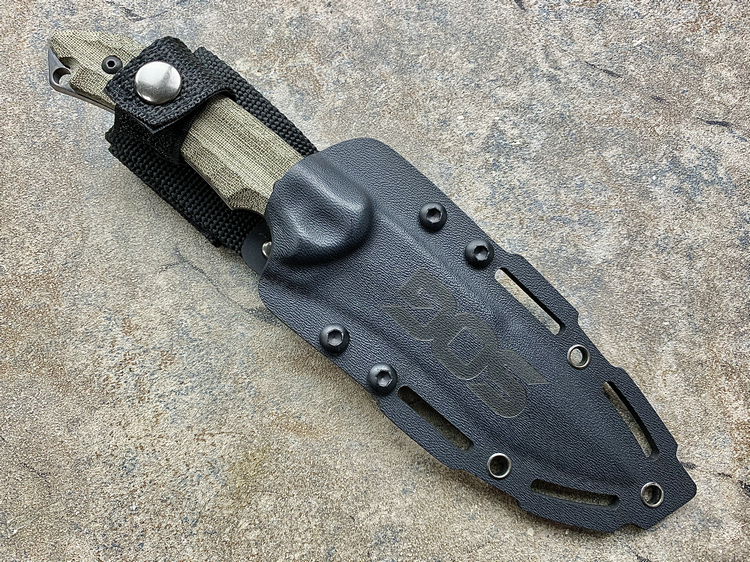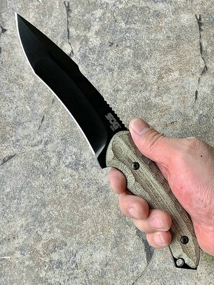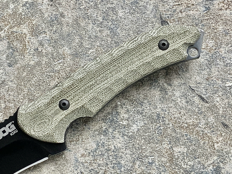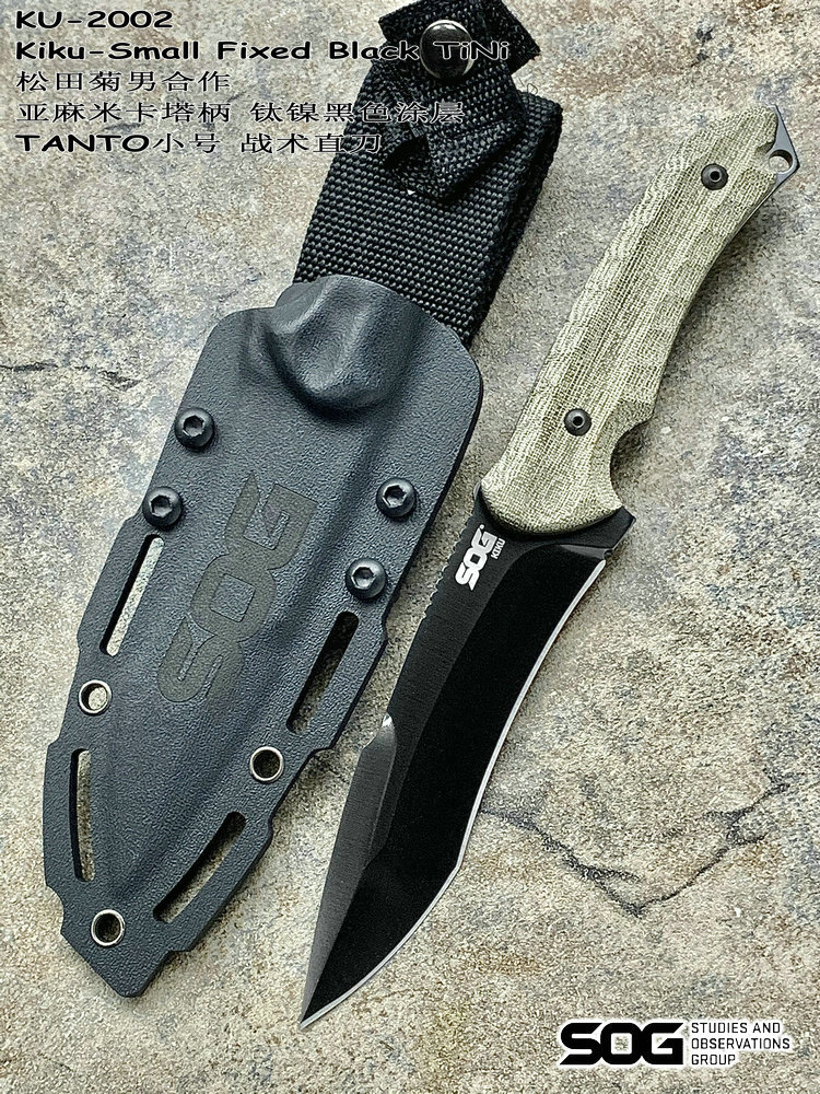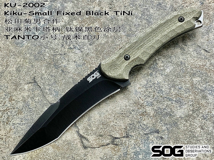 SOG与著名刀匠松田菊男合作又一力作,由菊男设计的独特TANTO刀型在注重切割与穿刺能力的同时在刀头部位增强了一道刀筋这大大增强了刀身的整体强度,亚麻米卡塔刀柄不论我们是戴手套还是徒手持刀都可以很好的握持,会感觉到刀是我们手臂的延长。