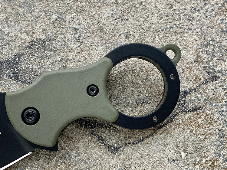 在手柄的刀背上,有帮助拇指按压的指槽与滚花凹槽。 在手柄内侧,也有帮助手指抓握的带有锯齿的指槽。 手柄里的指槽与尾环形成了一个反向的S形,抓握起来舒适度更高。 在尾环的最底端,凸出的是手柄贴片制成的伞绳孔。