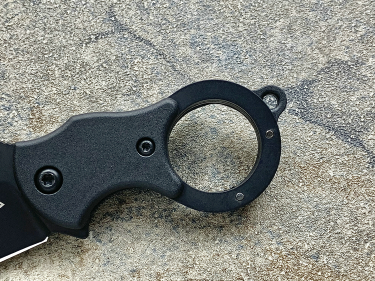在手柄的刀背上,有帮助拇指按压的指槽与滚花凹槽。 在手柄内侧,也有帮助手指抓握的带有锯齿的指槽。 手柄里的指槽与尾环形成了一个反向的S形,抓握起来舒适度更高。 在尾环的最底端,凸出的是手柄贴片制成的伞绳孔。