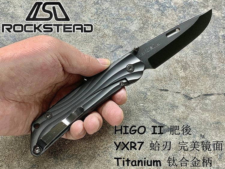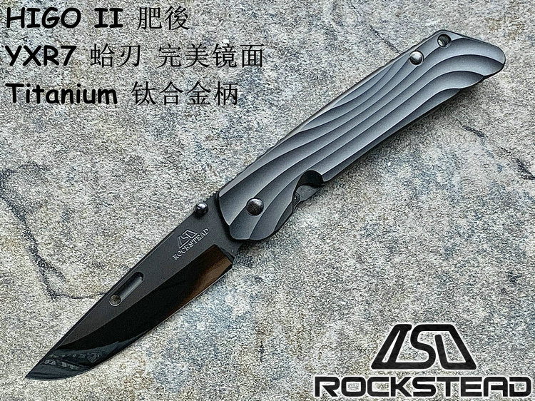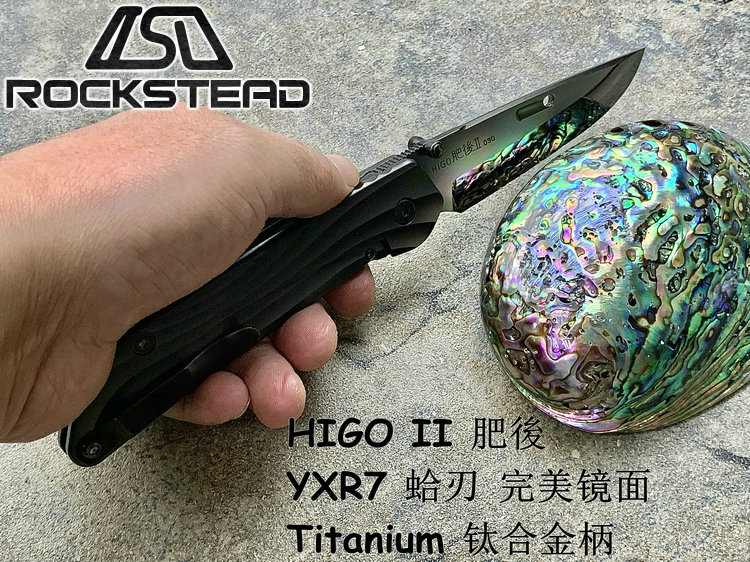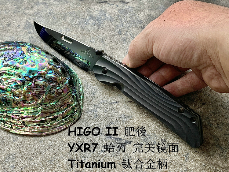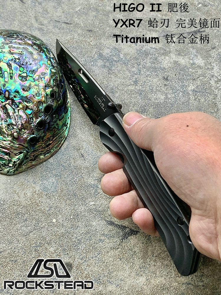 重量:142g 肥後是花田洋第一款一体框架锁结构作品,并在原型款基础上进行了材质等诸多改变。要说花田洋品牌刀具中哪种型号刀的扩展型号最多,那毫无疑问就是肥後 HIGO。 花田洋官网对这款肥後作品进行了如下的评价说明:“这把刀是肥後系列刀具中的旗舰版产品。尽管有各种钢材和刀柄材料的组合可供选择,但我们还是不由自主的选择了这个组合。YXR7材质的刀片在切割马尼拉绳1000次以后仍可以轻松的切削纸片。这把刀的刀身底部角度为30度,并向刀尖处进行连续的变化,直到顶部边缘的角度为24度。这种角度的变化是Rockstead刀具如此锋利的一个重要原因,刀具拥有卓越的锋利度。在使用后请将刀具擦拭干净,经过不断的擦拭这把刀将永久的闪耀光芒。并且在很长一段时间内,你都可以享受它锋利的切削能力。这把刀的手柄是由两个螺丝进行固定的,故此它是很容易被分解的。在切割鱼或动物后,都能很轻松的将刀具清洁打理。” 这款肥後使用YXR7钢锻造,让刀身硬度可达到64.4 HRC。刀身采用花田洋独特的蛤刃研磨手法,让刀具更加强壮锋利。那么到底什么是蛤刃?其实简单来说蛤刃就是一种独特的凸磨手法,是花田洋根据长期计算分析和无数次的实践得来的最优结果。这种凸磨手法让刀具刀根处的开刃角度为30度,并一直连续减少直至刀尖处开刃角度变为24度。众所周知凸磨手法在刀部强度上远远高于平磨凹磨,但锋利度上有所不如。而经过优化计算后,花田洋独创的蛤刃和精细手工研磨让刀具兼顾了出色的强度和锋利度。极为细腻的全手工打磨让刀具刃部也进行镜面抛光,YXR7钢材料是一种不容易做成一把小刀。然而,它的高硬度和高韧性使它一个很好的选择作为刀具钢的材料。它的一个缺点就是它有点容易生锈。然而,当它被涂上HPC或DLC,来弥补这个损失,得到了一个永久的美。刀根侧阳极氧化处理的双头圆柱状推刃柱方便左右手开刀,在刀根两侧分别印刻花田洋标志和产品型号编号。 刀具柄部使用钛合金。刀柄各部分的波状槽口让使用者无论是正握或是反持都非常顺手。经过表面处理的手柄为使用者提供了出色的把握感受。刀具使用真皮刀鞘并佩赠内六角拆卸工具。