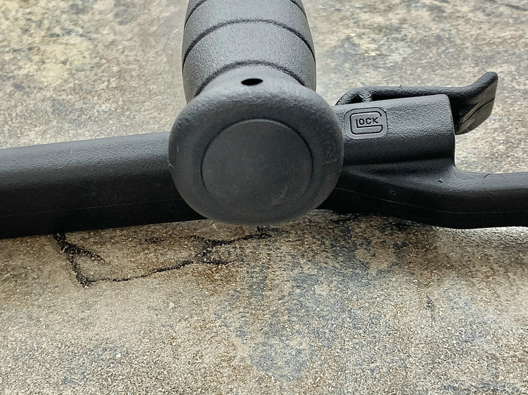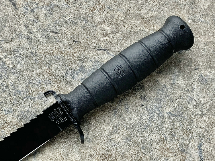 格洛克刺刀的刀柄非常简单,五条横向凹槽可以提高握持力。刀柄尾部有个挂绳孔,末端的插孔平时用一个插头封闭。这个与刺刀座相连接的部分也保留到了民用型号上,必要时可以将刀子插到木棍前段,充当临时的长矛。