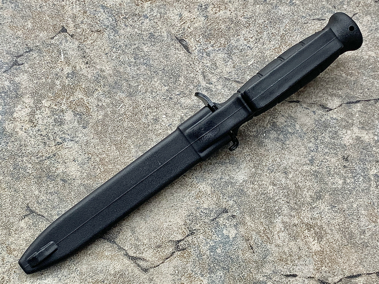 固定刺刀的卡扣、腰带环和刀鞘是一体铸造成型的,利用了材料的弹性完全可以满足使用需要。没有任何金属零件,刺刀插入刀鞘后,就被牢固的锁定,掏出时必须按动刀鞘上的卡扣才能将刀拔出。这个设计无比简单,奥地利陆军最欣赏它的优点--廉价。