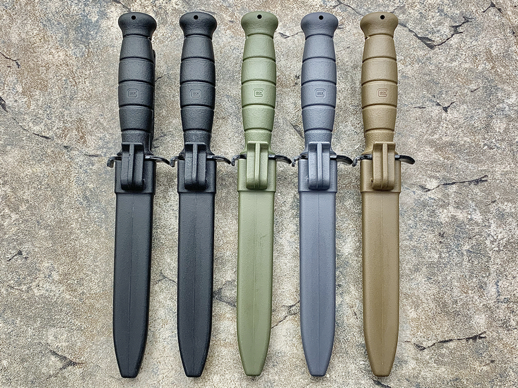 最初,格洛克刺刀采用橄榄绿色和黑色塑料制造刀鞘和手柄,刀身采用黑色电泳处理。最近的目录中增加了灰色和暗沙色的型号,刀身表面处理工艺则引入了电泳涂料,这种新的表面处理工艺确保了优异的耐腐蚀性和耐磨性。