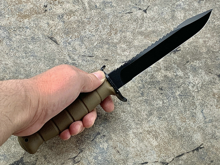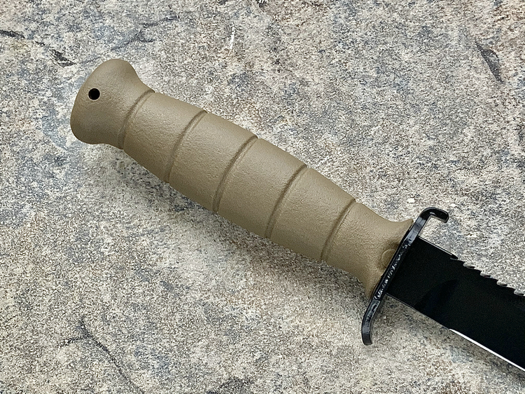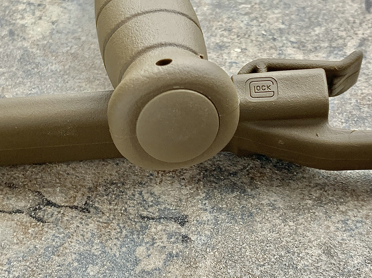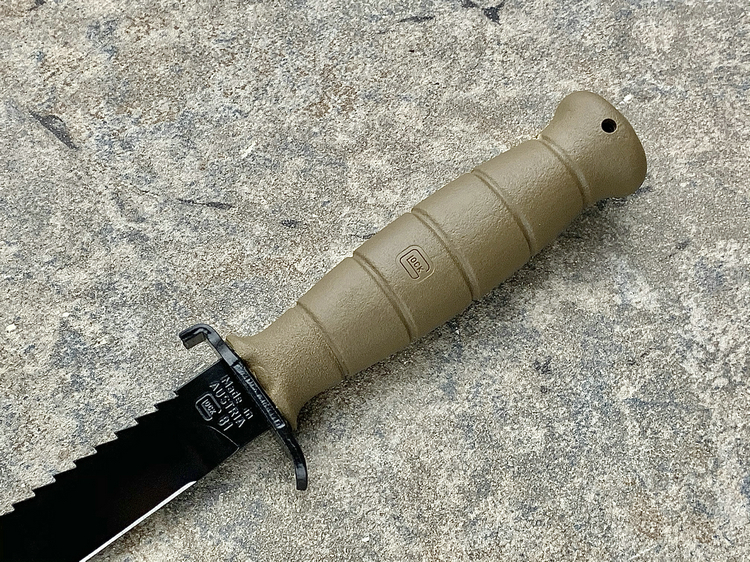格洛克刺刀的刀柄非常简单,五条横向凹槽可以提高握持力。刀柄尾部有个挂绳孔,末端的插孔平时用一个插头封闭。这个与刺刀座相连接的部分也保留到了民用型号上,必要时可以将刀子插到木棍前段,充当临时的长矛。