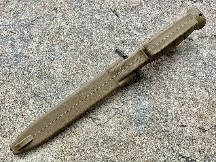 固定刺刀的卡扣、腰带环和刀鞘是一体铸造成型的,利用了材料的弹性完全可以满足使用需要。没有任何金属零件,刺刀插入刀鞘后,就被牢固的锁定,掏出时必须按动刀鞘上的卡扣才能将刀拔出。这个设计无比简单,奥地利陆军最欣赏它的优点--廉价。