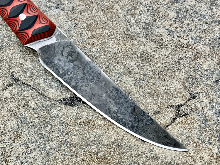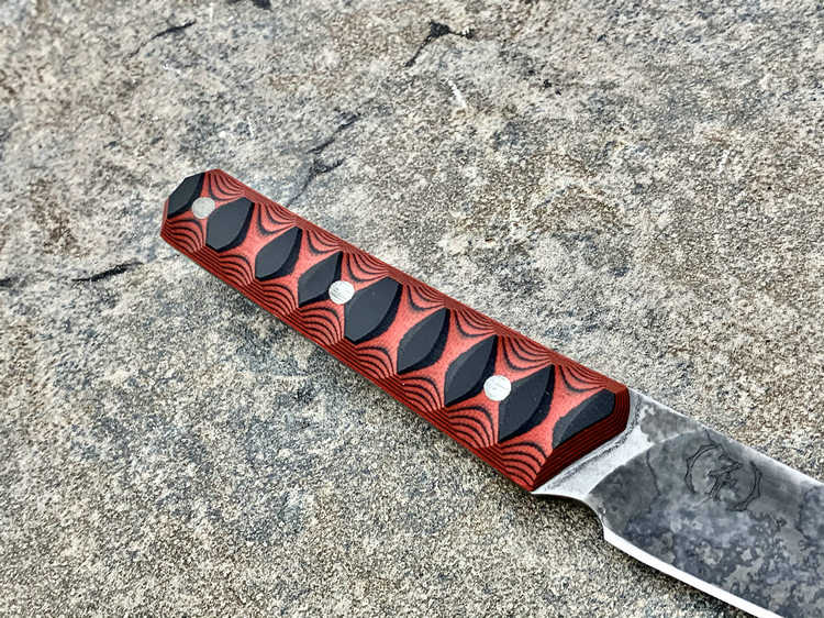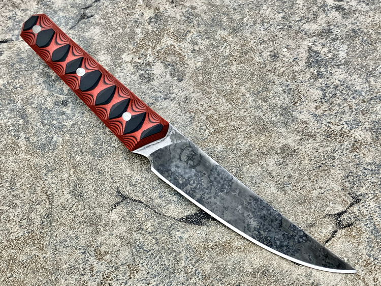 它采用的是一体式全龙骨制造。 5160弹簧钢制成的刃片使用氯化铁溶液进行蚀刻,以此来保证刀片表面的光洁度,从而做出与世界末日背景相契合的刀片效果,这种处理方式不仅能保证外观上的效果,还能赋予钢材更高的抗腐蚀性。
