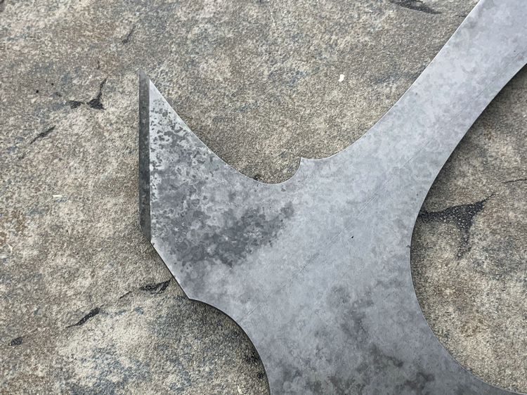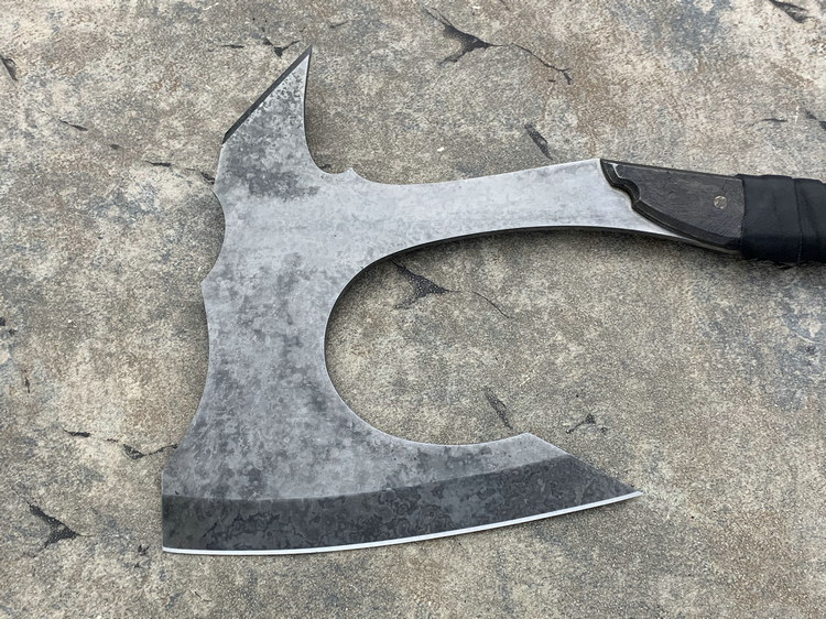 它采用的是一体式全龙骨制造。 6150弹簧钢制成的刃片使用氯化铁溶液进行蚀刻,以此来保证刀片表面的光洁度,从而做出与世界末日背景相契合的刀片效果,这种处理方式不仅能保证外观上的效果,还能赋予钢材更高的抗腐蚀性。