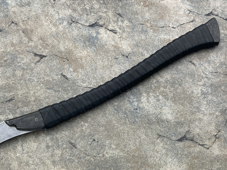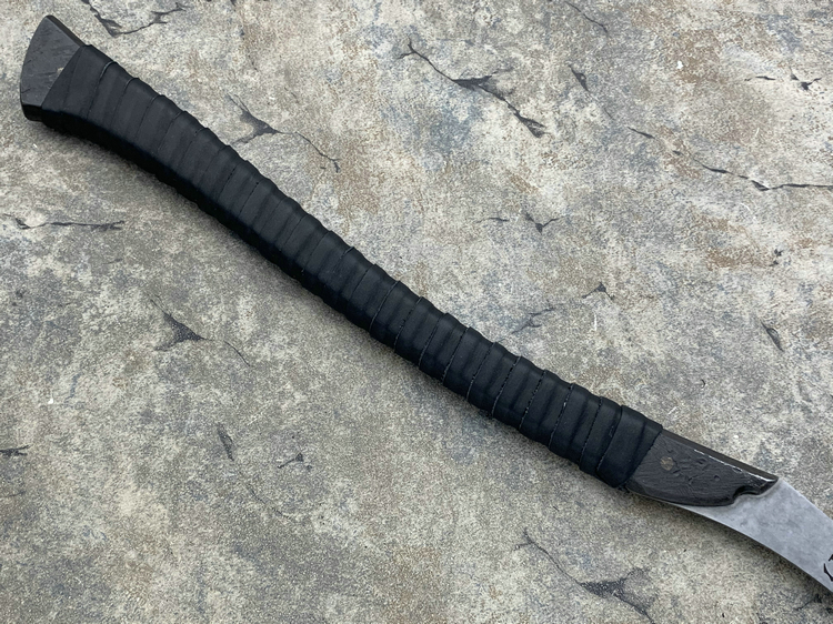 铝制剑柄带来一种不一样的“粗犷”的效果,引出一种工具刀的概念。为了提高对刀的抓握力,以及更符合世界末日的设计外观,手柄上包裹着黑色的牛皮皮革。