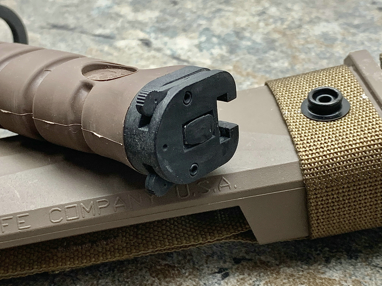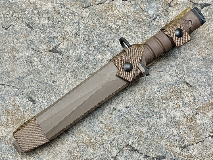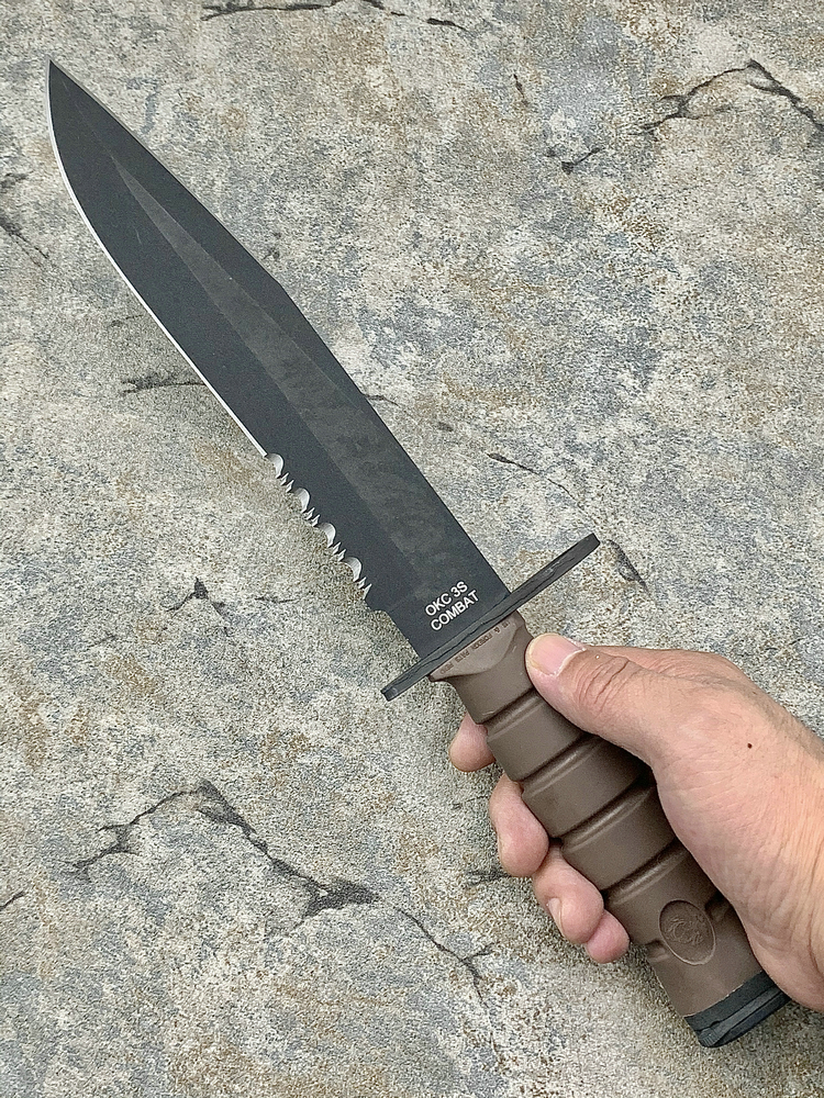 OKC3S USMCBayonet – 6504 :美国海军陆战队刺刀,为美军现役刺刀,配发美军海军陆战队使用。刀刃部分采用1095高碳钢制造,并在表面用军规磷酸锌技术处理的黑色防反光涂层,坚固耐腐蚀;背部同样开有一段刃,用以提高穿刺力;刀鞘背部附带一根陶瓷磨刀棒,可供士兵随时打磨;附带MOLLEY 模块化刀鞘背负系统,同样可以选装安大略腿部刀鞘附件;刀鞘内有钢制卡隼,以防止刀具意外脱落;按照人体工程学设计的手柄,贴合手掌使用。