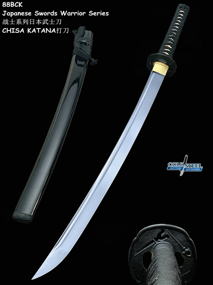 Cold Steel刃厂一直坚持使用传统材料来制造日本刀,护手(镡)和柄头(头)都用黑铁铸成,而且做工考究。黄铜鞘口(鲤口)是用全手工制作抛光而成。手柄上包裹的是真鲛皮,并且用黑线用传统十字交叉方式缠裹。刃刃都用1055高碳弹簧钢,由经验丰富的职业刃匠手工锻造打磨,按照传统日本铸刃方法制造而成。每一把刃都配有一个黑色漆面木鞘。