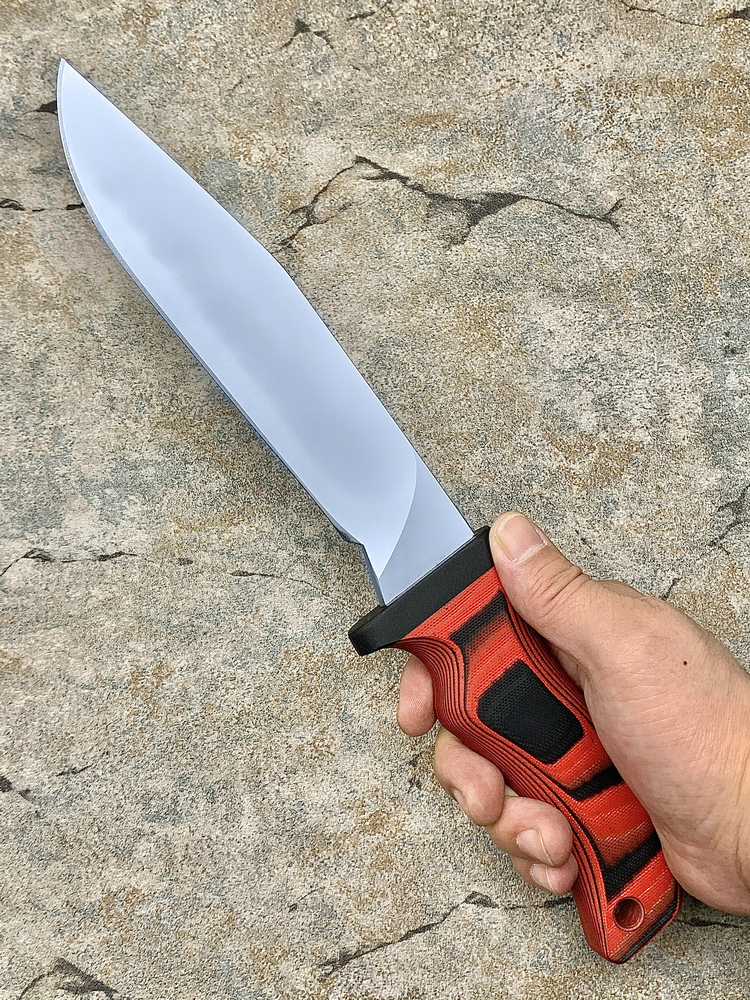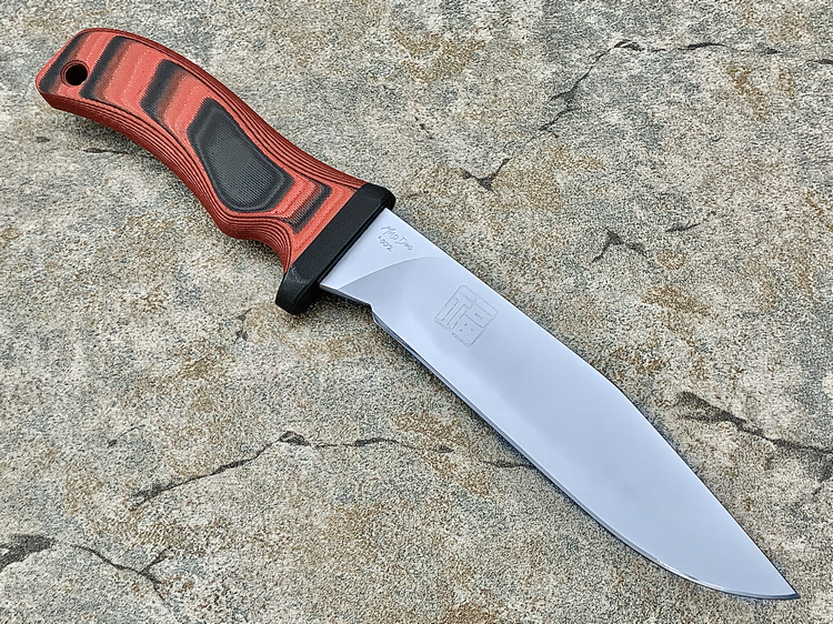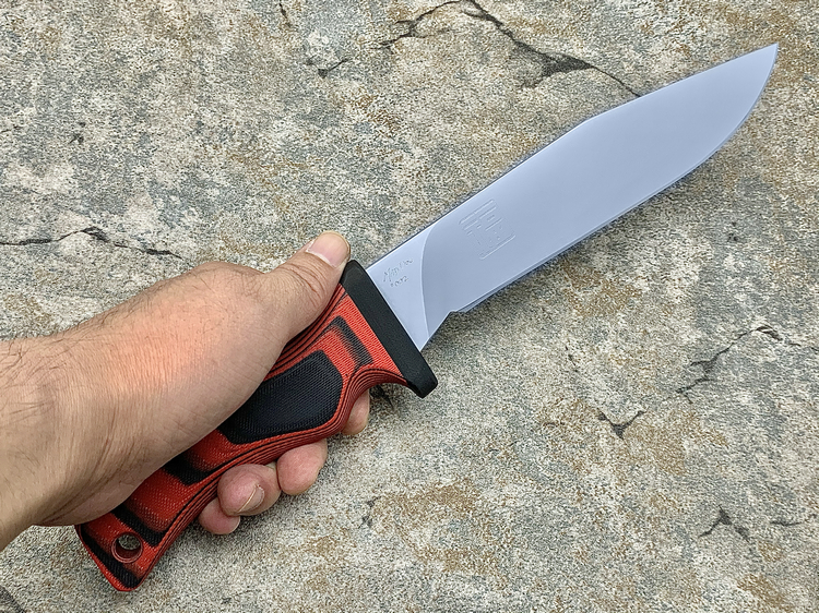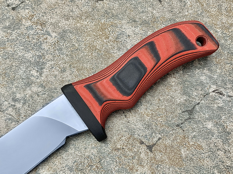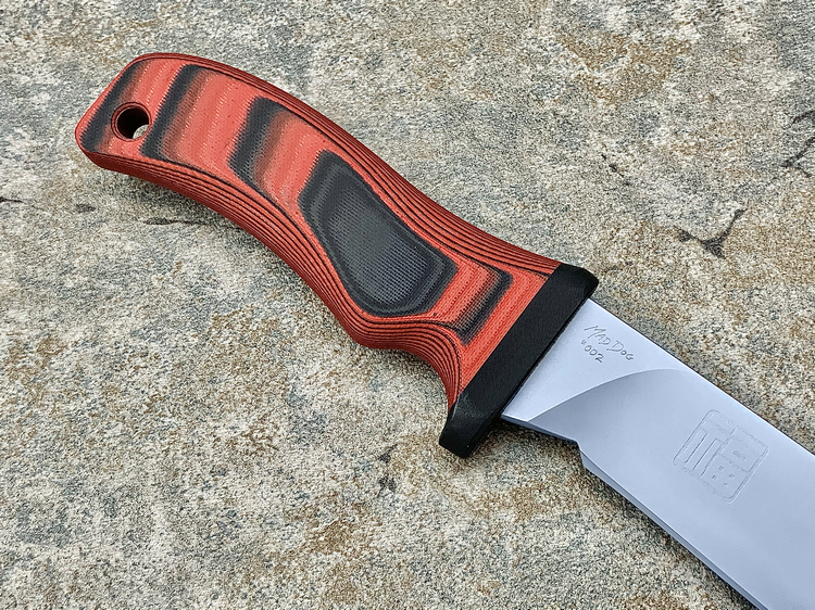 它的手柄符合人体工程学设计,把握极其舒适称手。食指凹槽让使用者即使看不见也能凭手感找到握刀的位置。材料使用特殊的玻璃纤维与环氧基树脂合成来做刀的握柄。此种特殊材质每一平方英寸可承受79000磅的压力(约3600公斤),可以轻易地承受0.45口径子弹的冲击。因此Mad Dog刀的握柄就算很严苛的使用也不会造成损害。此种握柄材质同时也提供了极好的绝缘,每0.001吋可承受1000伏特的电压,因而可以保护持刀者不会在使用刀具时遭受电击。另外这种握柄材质也几乎不受化学物质的渗透及侵蚀。