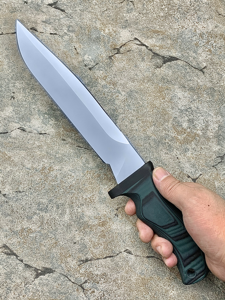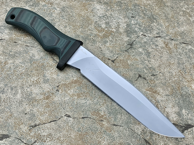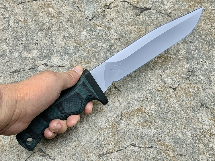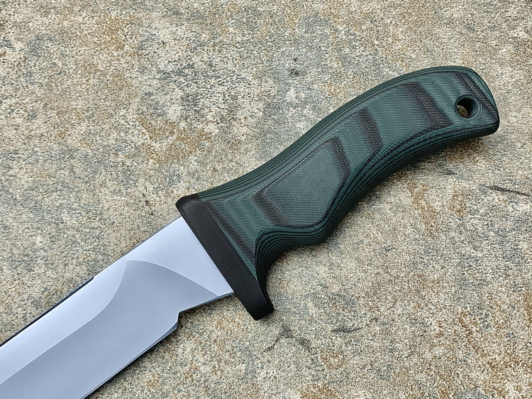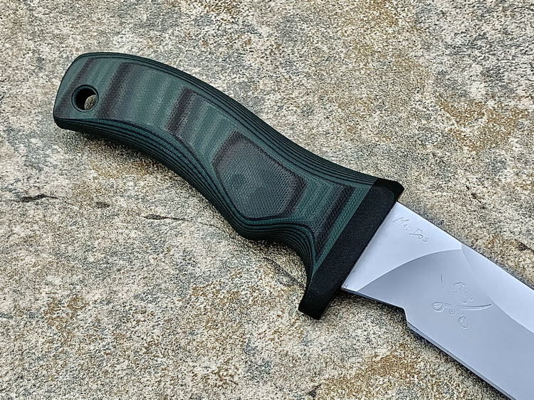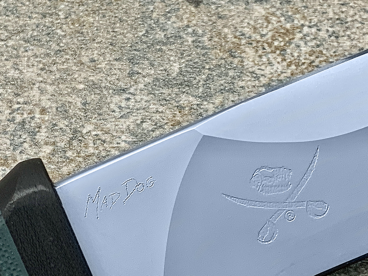 它的手柄符合人体工程学设计,把握极其舒适称手。食指凹槽让使用者即使看不见也能凭手感找到握刀的位置。材料使用特殊的玻璃纤维与环氧基树脂合成来做刀的握柄。此种特殊材质每一平方英寸可承受79000磅的压力(约3600公斤),可以轻易地承受0.45口径子弹的冲击。因此Mad Dog刀的握柄就算很严苛的使用也不会造成损害。此种握柄材质同时也提供了极好的绝缘,每0.001吋可承受1000伏特的电压,因而可以保护持刀者不会在使用刀具时遭受电击。另外这种握柄材质也几乎不受化学物质的渗透及侵蚀。