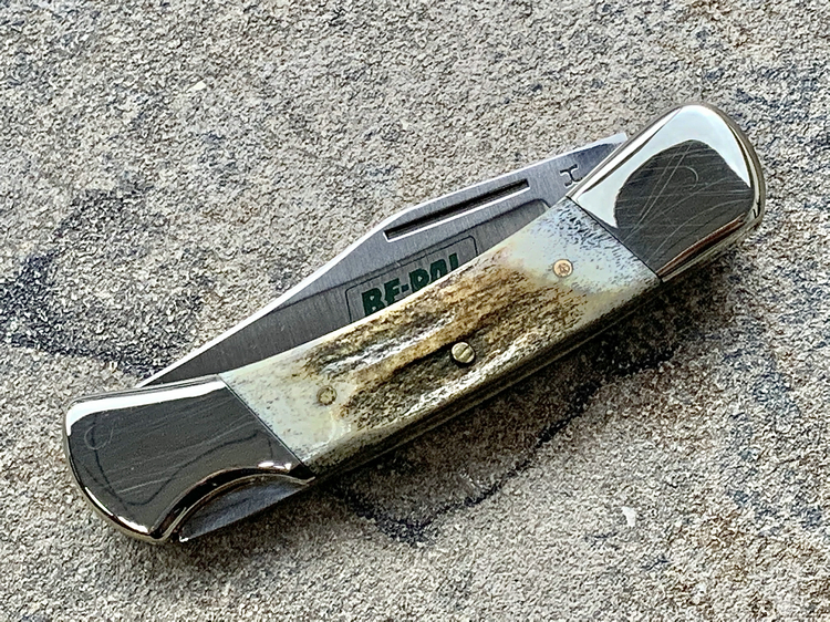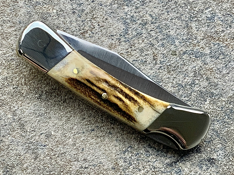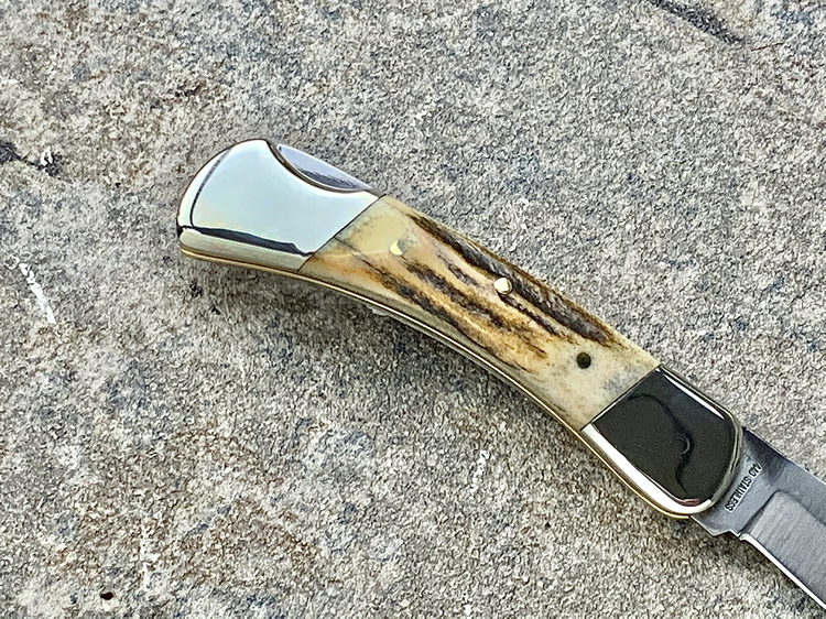 鹿角柄口袋刀,原始粗犷风格,天然鹿角越盘越润,镍银刀枕相比于黄铜质地坚硬更耐磨损,白色金属更彰显优雅!