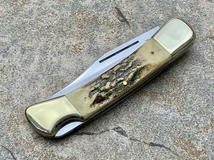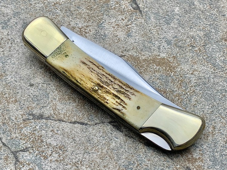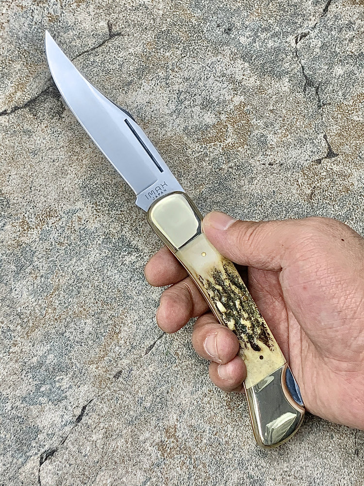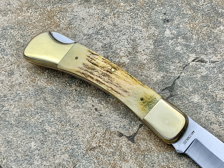 鹿角柄口袋刀,原始粗犷风格,天然鹿角越盘越润,镍银刀枕相比于黄铜质地坚硬更耐磨损,白色金属更彰显优雅!