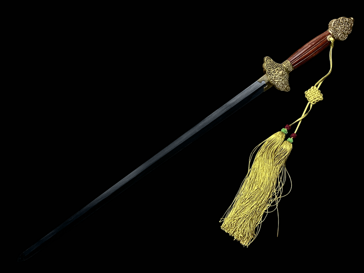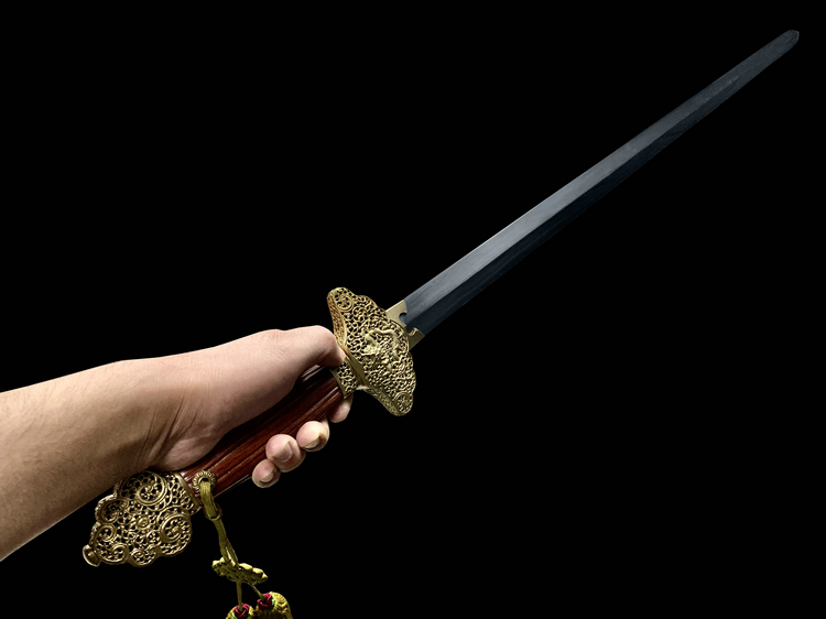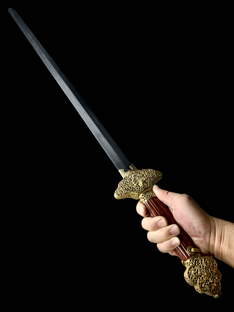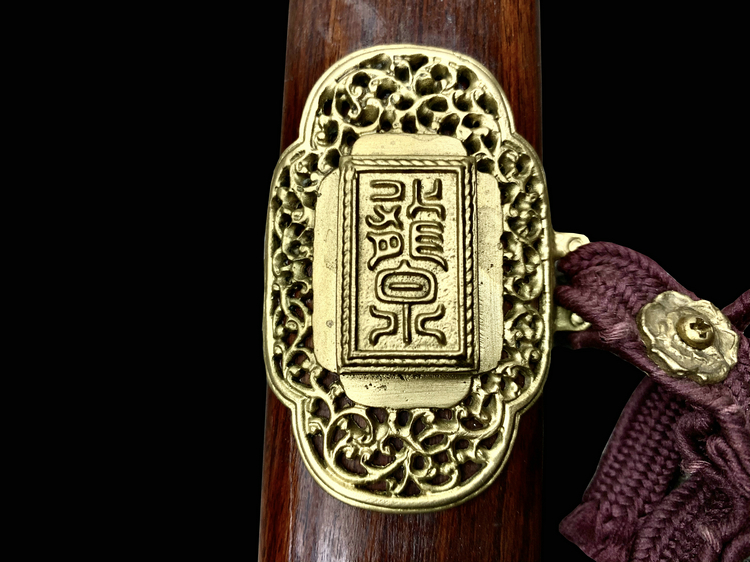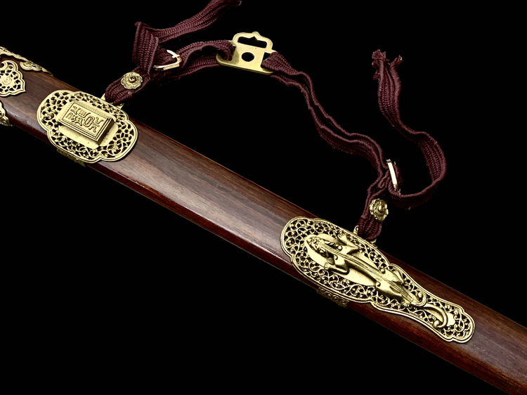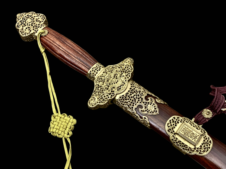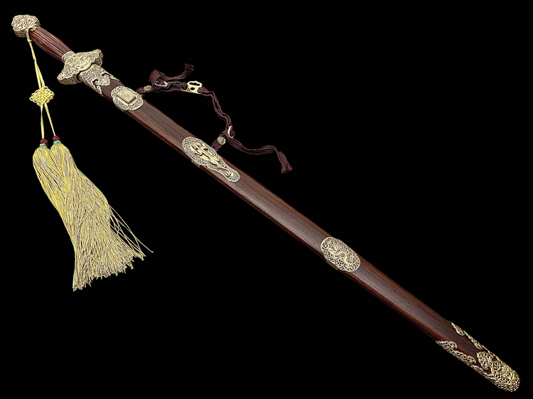 此剑装饰华丽异常,其装具制作工艺复杂之极,在密如针孔般复杂的镂空卷草纹上点缀上花卉纹,并采用先铸后刻的方法在剑格上制出四爪金龙.并配花梨木鞘,富丽堂皇,极具皇家气派.由鞘装上”龍泉”二字推断,此剑应是由皇室从龍泉制剑地区定制,用于自用或赏赐大臣的宝剑.
