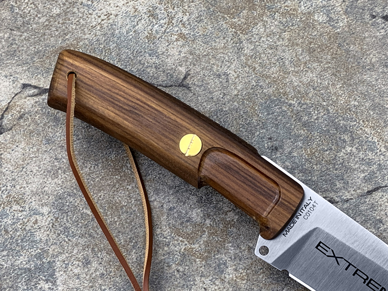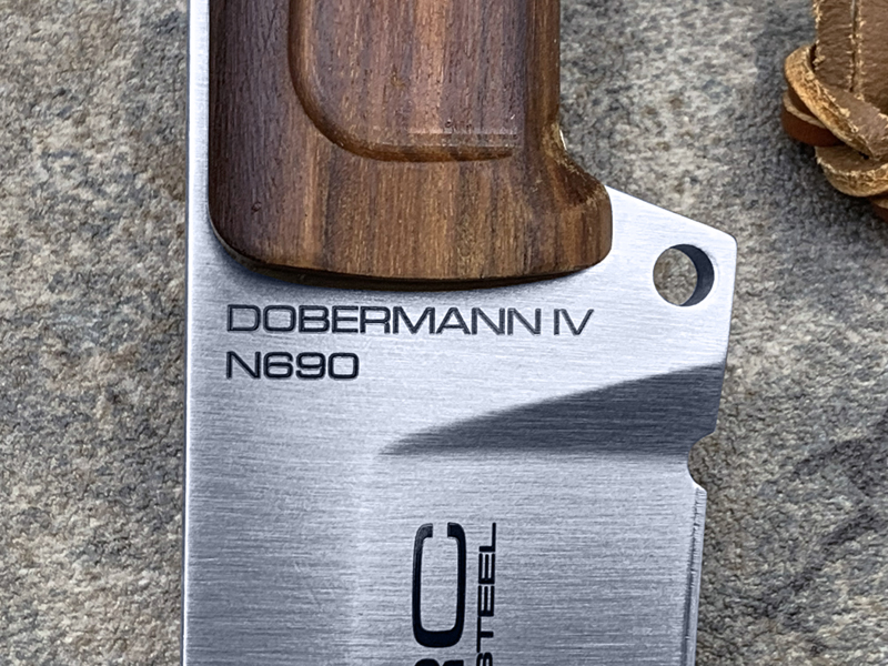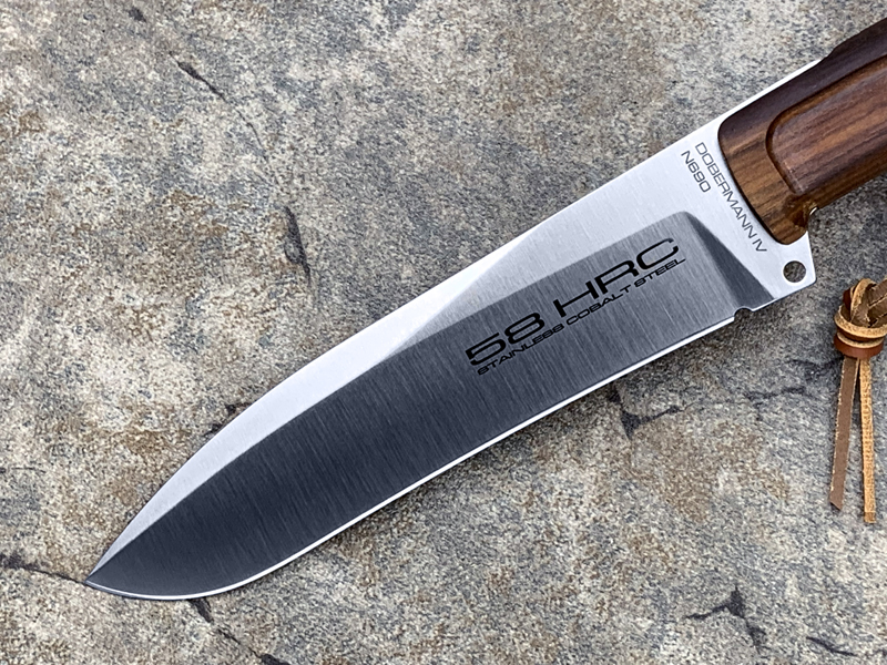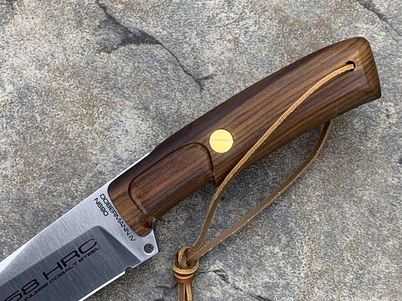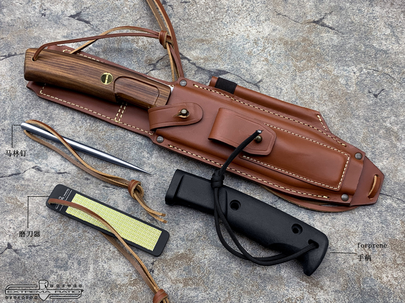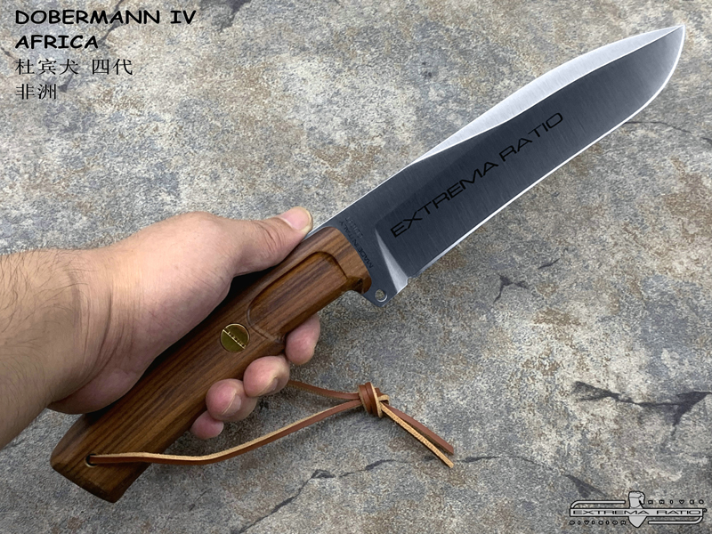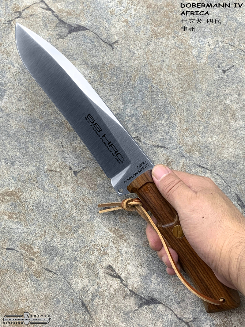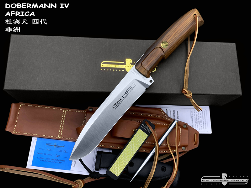 全长:336mm 刃长:169mm 刃材:N690 硬度:58HRC 刃厚:6.2mm 刃宽:44.2mm 重量:393g 刀鞘:皮鞘产地:意大利 Dobermann IV Africa是专为专业猎人准备的刀具。 刀片钢为Bohler N690,这是一种富含铬,钒,钼和钴的奥地利不锈钢,其显著特征是硬度(必不可少的高效磨削)和保持高柔韧性。 杜宾犬四代非洲将配备两种不同的手柄:一种是桑托斯花梨木,另一种是氯丁橡胶。 这样,使用者可以根据自己的需要轻松地更换手柄。 此外,它将配备意大利手工皮革护套,磨刀器和不锈钢马林钉。