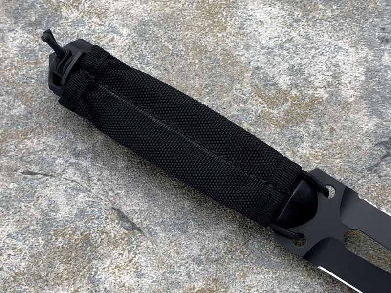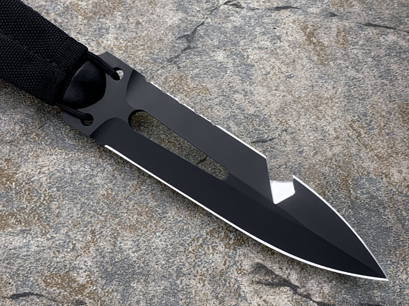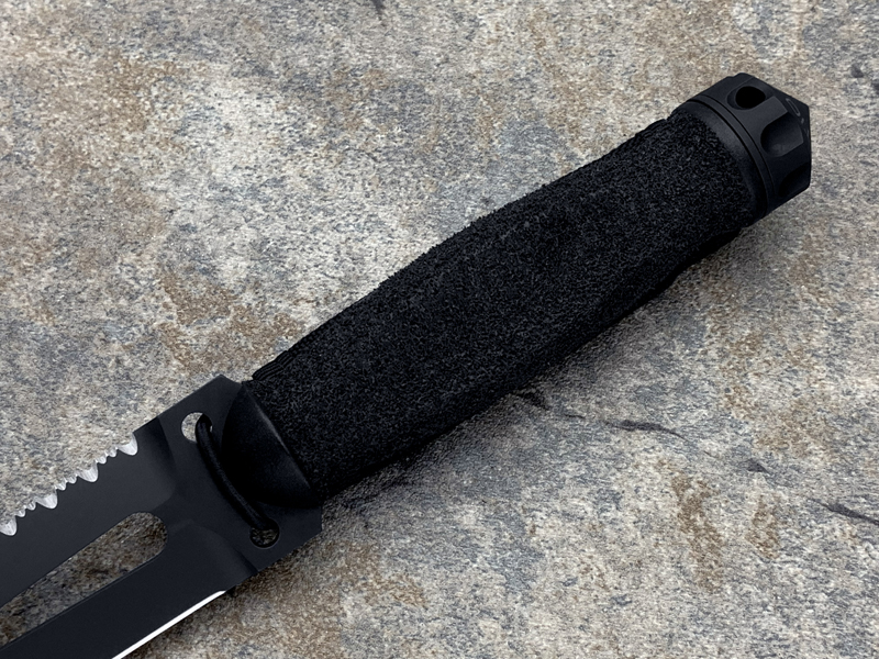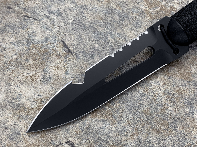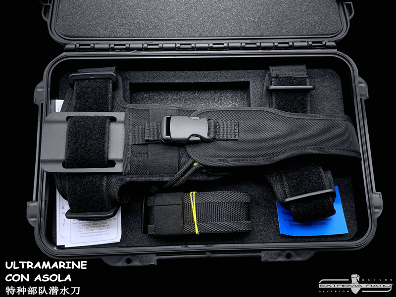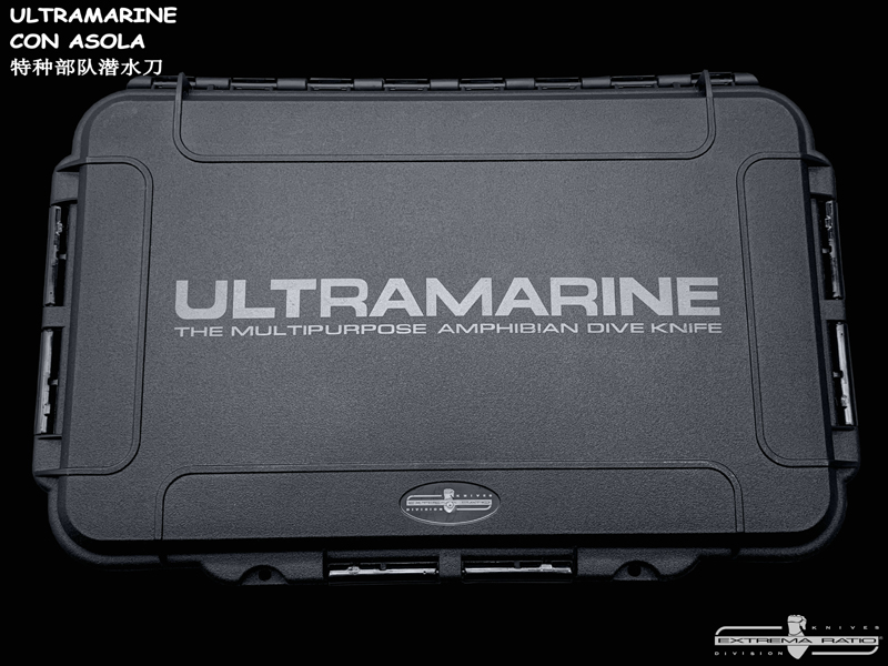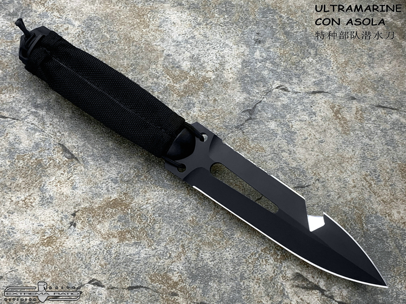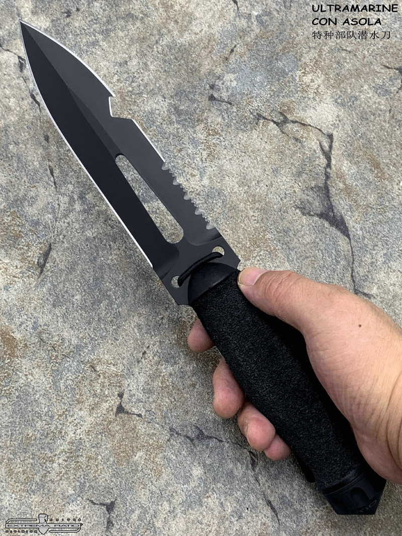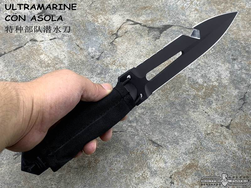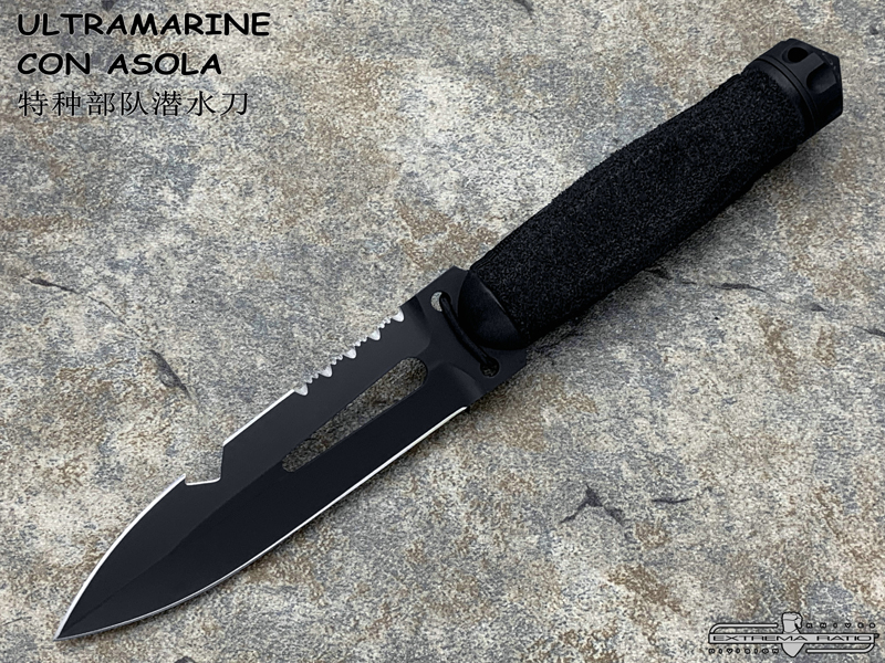 全长:297mm 刃长:150mm 刃材:N690 硬度:58HRC 刃厚:6.3mm 刃宽:37mm 重量:374g 刀鞘:K鞘产地:意大利 ULTRAMARINE CON ASOLA特种部队潜水刀(极端武力),军刀中的贵族 ,是来自意大利的年轻刀厂,专门为军方开发研制和生产军用刀具,旗下产品以独特亮眼,极富军事战斗气息的造型,迅速在刀界打开了知名度。1997年,Maurizio Castrati 与 Mauro Chiostri 创办了 Extrema Ratio 公司。1998第一个型号问世, Dobermann实践了 Extrema Ratio 创造一把融合优秀技术品质和卓越设计的中高档产品刀的理念;这把刀在意大利取得非常好的销售业绩,并且进一步得到全球行家的认同。Extrema Ratio是一家历史不长的刀具公司,但是由于他们出品的刀具采用了计算机和手工协作的方式,所以设计精良。迅速被全世界刀具使用者和收藏者的青睐。现在他们出产的刀具大部分都供应意大利军方,剩余的一小部分流向民间市场,已经成为了广大刀迷竞相购买的焦点!Extrema Ratio最大的特点就是设计精良,用料考究。他的每一把刀的厚度都要比同类其它的刀厚一倍左右,而且每一把刀都杀气腾腾,充分的体现了军用刀具的冷酷。粗旷耐用的设计导向,镖捍的外形,Extrema Ratio刀具想要传达的信息自是不可言谕。以科技化和精益求精的制作品质,Extrema Ratio算是走出了成功的第一步。时间会证明Extrema Ratio在竞争激烈的军用刀具市场永不动摇的地位。 这把ULTRAMARINE是由极端武力公司和意大利特种潜水部队和平民水下作业专家协调合作,经四年的研究和开发后完成的项目,这是一种特别适合于水下和两栖类业务所使用的多用途专业工具,可以帮助水下专业人士克服困难和挑战。 和很多的陆地刀具一样,这把刀刀片质量非常沉重,可以高效率的砍伐树枝和灌木,帮助搭建避难场所,伪装掩体,担架等工作。刀具上拥有的锯齿可以方便切割绳索,刀柄末端可以完美的充当击锤或玻璃击破器,而靠近手柄的刀片锋利部分可用于水下作业的精密切割。 这把刀的刀身采用哑光处理,减少光线的反射令这把刀更适合在敌对环境下的使用。护套上拥有两块金刚石打磨板,可以分别为刀具的刃部进行细致打磨。随刀配送两根TEK-LOK腰带,和额外赠送的两根腿部绑带,1个橡皮擦,2个额外的O型环,1个额外的TEK-LOK螺丝,1个额外垫圈和1根红色的尼龙搭扣带。 此外,ULTRAMARINE的手柄设计为可拆卸类型,将刀片连接到一个杆子上就组成了一支长矛。