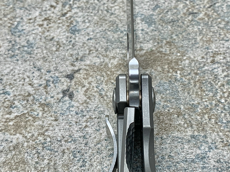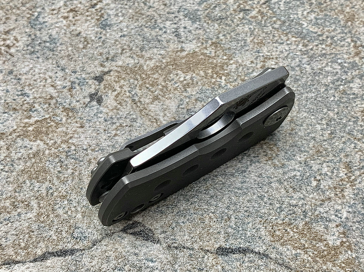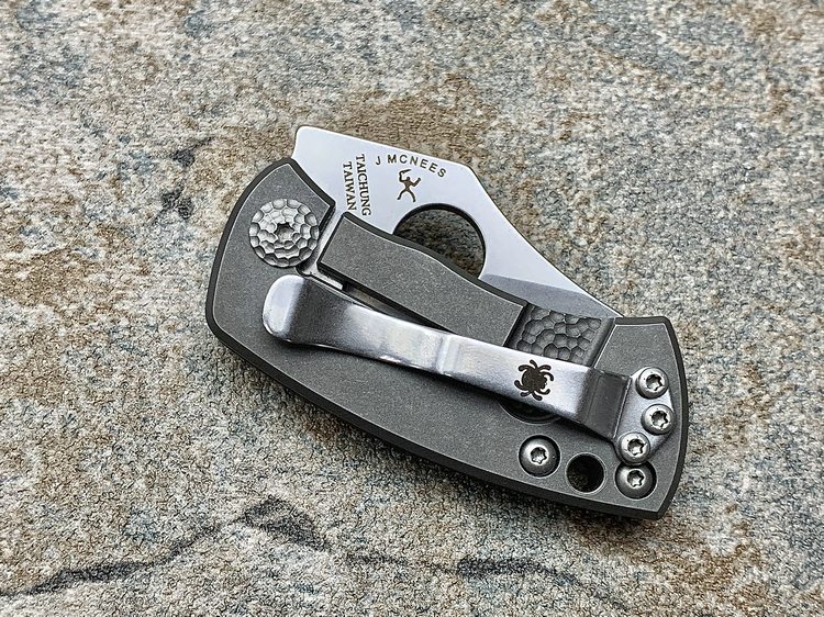 石洗抛光的刀片与配有精密机加工钛合金的手柄相配。正面(近侧)刻度尺具有一系列镂空孔,而背面的刻度尺则形成了刀具坚固的Reeve整体锁(R.I.L.)机构的基础。两种刻度盘均具有粗糙的哑光效果,并以McNees的标志点刻在锁定凹口和枢轴销螺丝头上来突显。抛光的不锈钢背夹提供右侧向上翻倒的便利,并由带衬里的挂绳孔支撑,可轻松连接挂绳和钥匙扣。