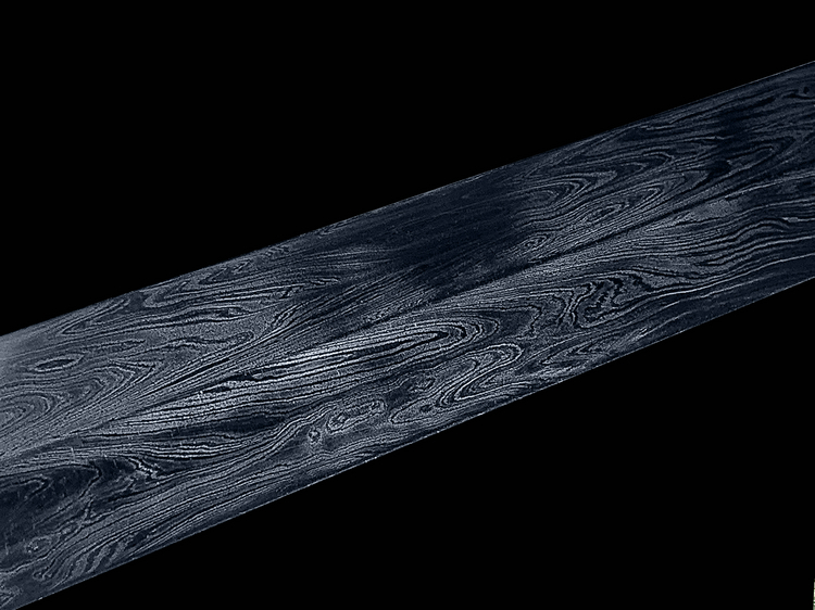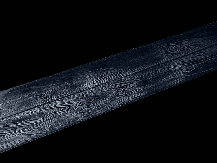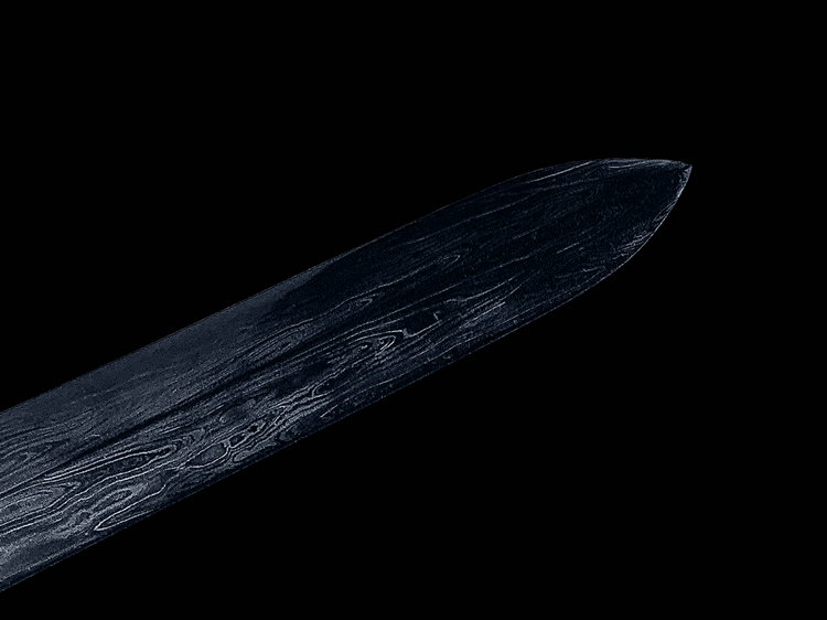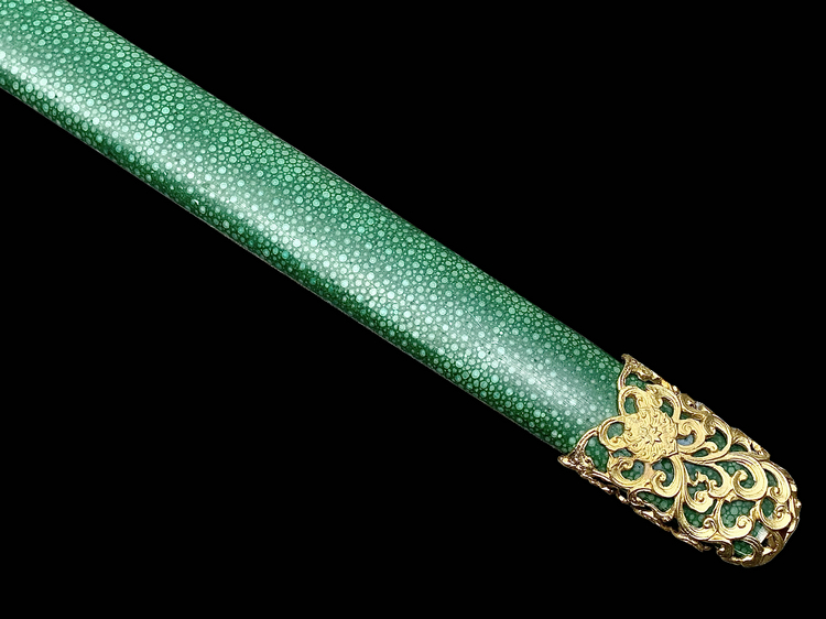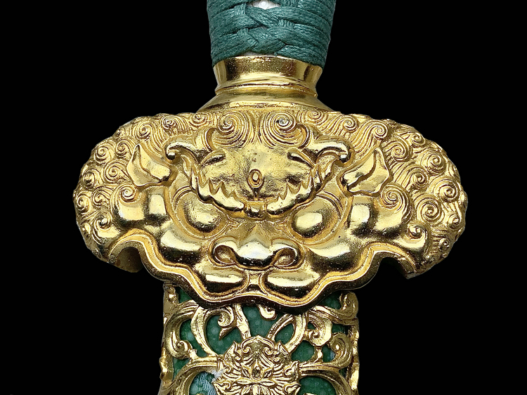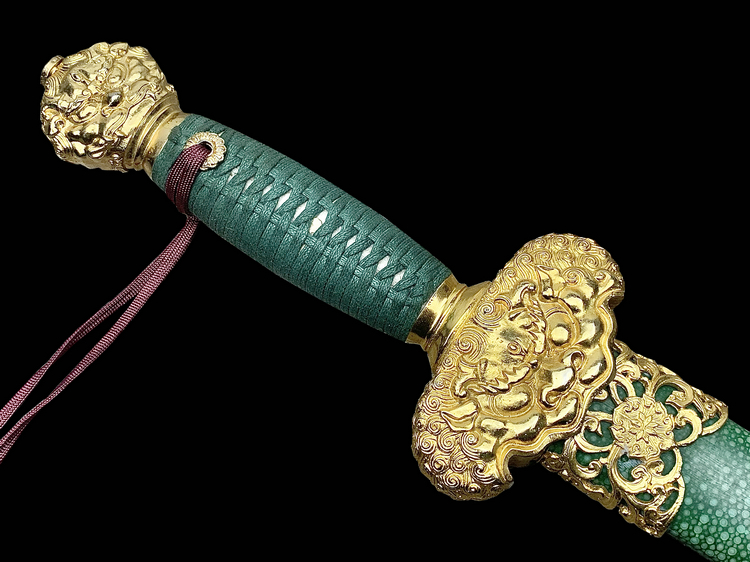 栩栩如生的中国狮子图案是用镍银铸造并鎏金,在厚重的剑挡及尾铁上有近乎雕塑般的细节。优雅的玉绿色绳包裹手柄和配套的红木鞘,外覆绿色鱼皮,以配合手柄。然而,最吸引眼球的特性是刀片本身。由我们最好的大马士革钢手工锻造和专业回火,其独特微妙的漩涡图案体现了精湛工艺与大马士革钢铁无与伦比的强度相结合的优雅之美。