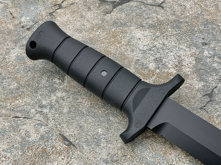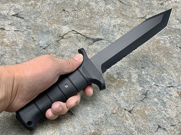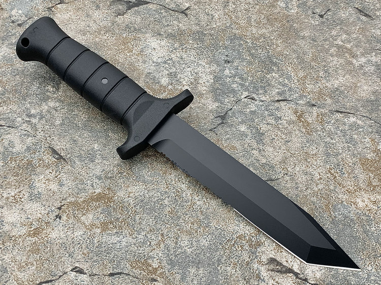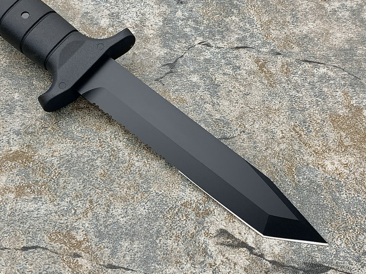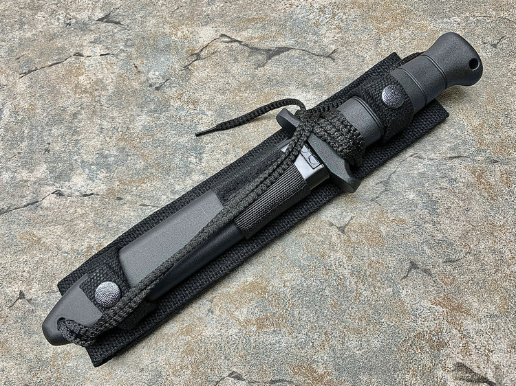 N695钢代替( HRC57-59)是更可靠和有效的保证.新开发的多锋刀刃结构再次提高了刀刃的承载力.kalgard涂层一体式刀片贯穿整个玻璃纤维工程塑料手柄可以很容易击碎玻璃.鞘设计适合所有美国、德国战术背心及裝具.鞘配有固定钻石磨刀器.