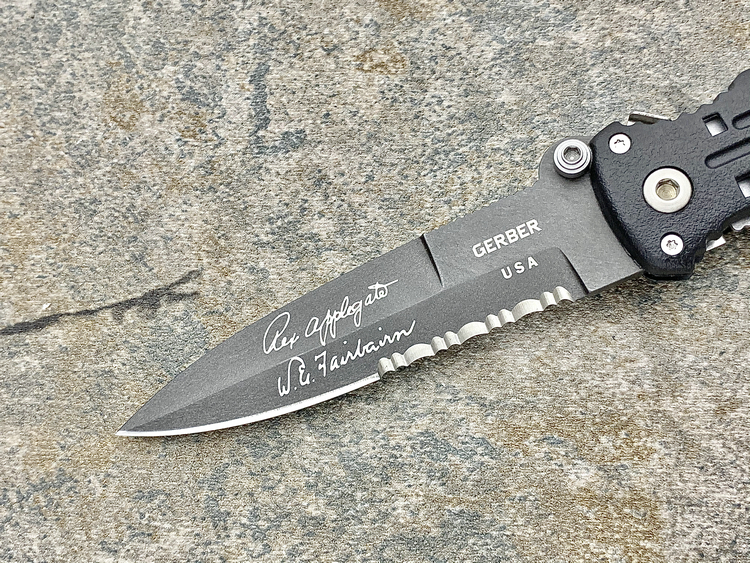 原产地: 美国 #05786此款APPLEGATE-FAIRBAIAN系列由CIA知名教练美国安普吉特(Mr.Colonel Rex Applegate)上校-一个比任何人更了解近身战斗的人所设计,并且也身为战斗刀设计者,依自己的作战经验,参考不同的任务需求,发展设计了此款刀子,此款APPLEGATE系列,不论单手正、反手握、双手握攻击推进式皆可,单手可以快速翻转,依据不同状况,使用不同的持刀方法,材质为最新154cm高碳钢不锈钢钢材,不锈钢核心结构,增加额外的强硬度。握把为特别的聚合物填充尼龙把手架构。刀刃是银色,刃面经弹珠抛光处理,附有背夹,以方便消费者取用,可夹在裤子及背包上。 是CIA圈内知名系列刀具 1.每支刀刃上,皆有设计者Mr.Colonel Rex Applegate的亲自签名。 2.设计者Mr.Colonel Rex Applegate已于公元1998年逝世-得年84岁高寿,祇有在生前,设计几款刃具,绝对值得珍藏。 此把刀为第一代戈博战斗折刀(Combat Folder)改良型,尺吋较小,非常适合东方人使用,刀身钢材采用了最好的154不锈钢,快单手开合是此款刀最大特色,此外,戈博在刀轴背部增加了第二道安全保险装置,能让使用者更安全的发挥此刀之用途,可以在最短时间内发挥最大的效果。 刀背部份为假刃设计(未开锋)。每把刀上有安普吉特的签名,并注编号,深具收藏及实用价值。 此款刀具隶属Gerber Applegate-Fairbaim种类的刀,是单手开启的,可适用许多情况。每支皆有不同序号,以提高收藏价值。 此款刀子设计不论单手正、反手握、双手握攻击推进式皆可,单手可以快速翻转,依据不同状况,使用不同的持刃方法。 表面黑色涂层。精密可调整枢轴,栓扣紧固扣钮。 双斜面刀身设计,刀刃背面为假刃设计流畅设计,握把具有止滑效果,就算水中使用也可以,手感极佳,不易脱落。