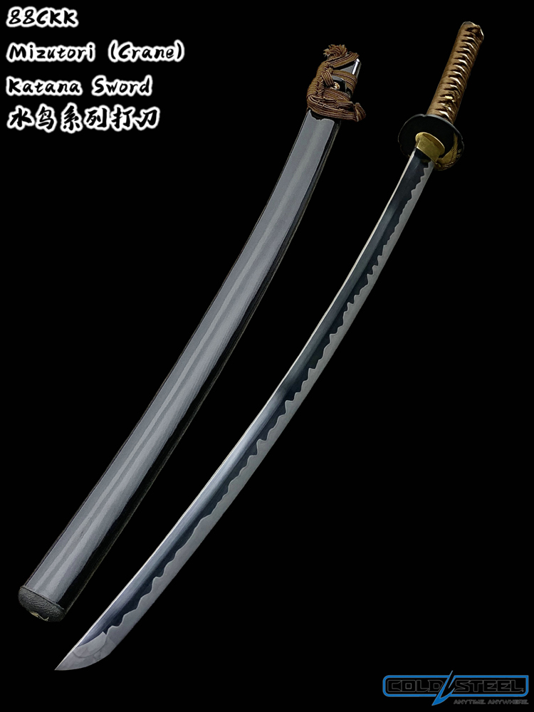 Cold Steel公司一直坚持使用传统材料来制造日本刀,护手(镡)和柄头(头)都用镍银铸成,而且做工考究。黄铜鞘口(鲤口)是用全手工制作抛光而成。手柄上包裹的是真鲛皮,并且用黑线用传统十字交叉方式缠裹。刀刃采用1095高碳钢,由经验丰富的职业刀匠手工锻造打磨,按照传统日本铸刀方法制造而成。每一把刀都配有一个黑色漆面木鞘。