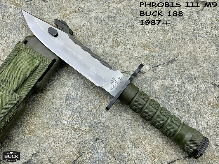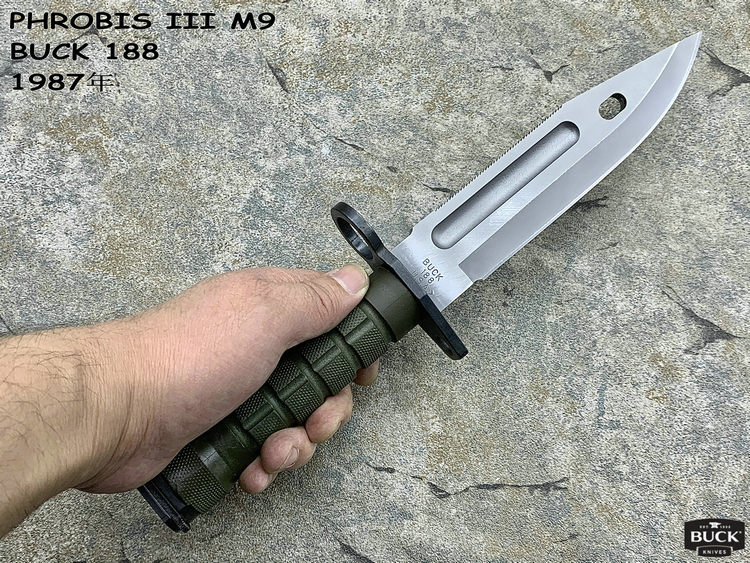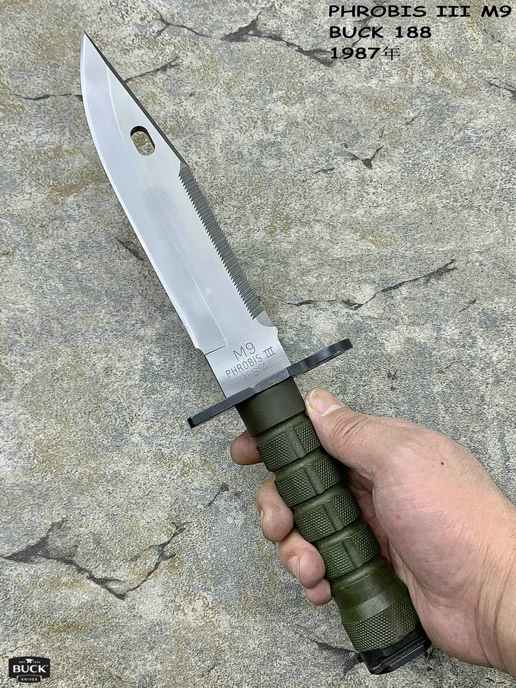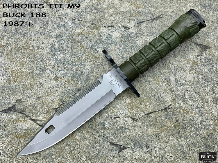 1989年9月,Phrobis Ltd完成美陆军M9式刺刀第一个合约,产量为315,600把。该批刺刀刀身标识为:M9 PHROBIS III U.S.A PAT PEND。有宽,窄字体区别。该合约刺刀由Phrobis Ltd授权BUCK公司代理加工生产(OEM),其特征为:护手和刀鞘上面均有由Phrobis字母组合成的海豚标志,刀鞘为双肩结构,上面有附件袋和磨刀石,刀鞘和刀把为橄榄绿色,刀刃为灰色右侧有锻造的血槽,护手上开有启瓶槽.