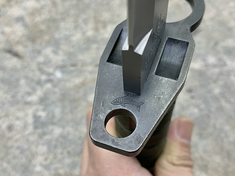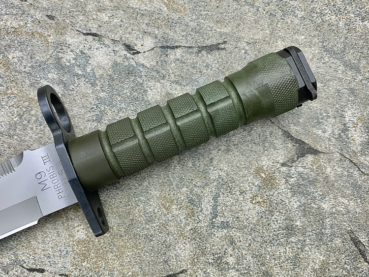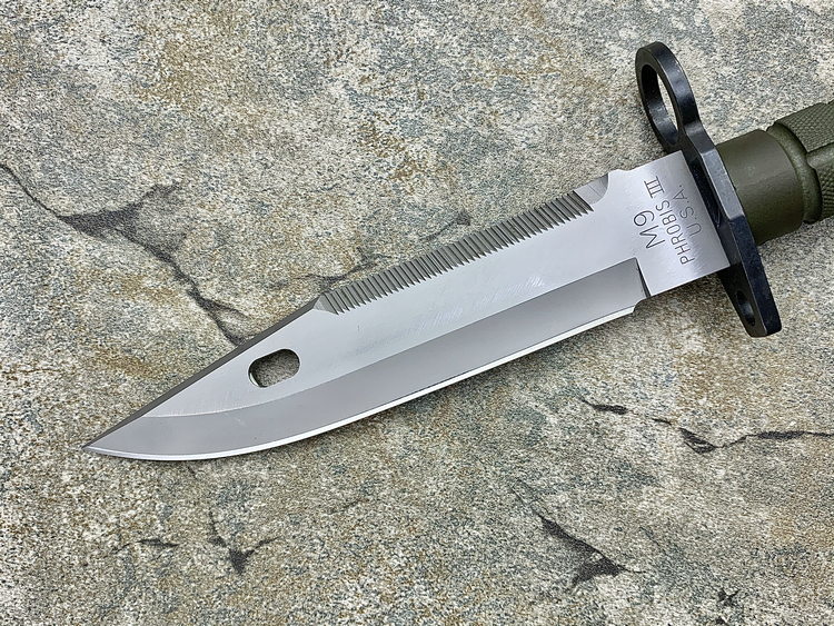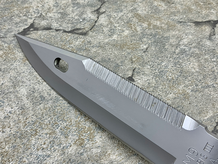 M9刺刀刀身用不锈钢锻压制成,与刀柄芯杆通过螺纹连接。刀身表面呈浅灰色,刃口部位经局部热处理,锋利无比。刀背上的扁孔套在刀鞘上的驻笋上并与之紧密配合,能剪断直径0.25in(6.35mm)铁皮箍或肋状钢丝网。刀背上的锯齿和锉齿坚硬而锋利,可锯穿飞机壳体,能锯断2in(50.8mm)厚的松木板和直径1in(25.4mm)的硬木棒。