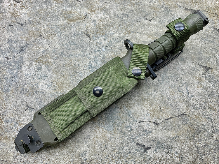 全长:310mm 刃长:180mm 刃厚:6mm 刃宽:35.5mm 刃材:425 mod 硬度:58HRC 产地:美国 重量:415g M9刺刀是一种多功能现代刺刀。它除了作为枪用刺刀和格斗匕首外,还可以当野战工具刀使用。M9刺刀就其系统结构来看,可划分为刀柄,刀柄座,刀柄芯杆,横挡护手,刀身,刀鞘,刀鞘镶件,磨刀石,挂带,腰带挂扣等。其中深绿色的刀柄是美国杜邦公司生产的ST801尼龙材料制成,呈原柱形,表面刻有网纹和环形槽,握持手感好,访滑,而且绝缘性能极佳。刀鞘也是用ST801尼龙材料制成,其强度也很高,正面附带条形纤维布袋,可装小件物品;背面贴有磨刀石,平时用纤维织带覆盖加以保护。刀鞘底部为钢制镶件,用内六角螺钉与刀鞘固定在一起,镶件上有驻笋和剪切刃口,螺丝刀刃口位于最顶端,该镶件即可作为改锥用,也可用作开瓶器。