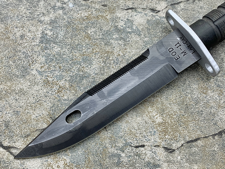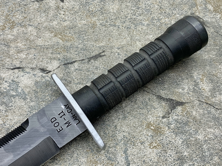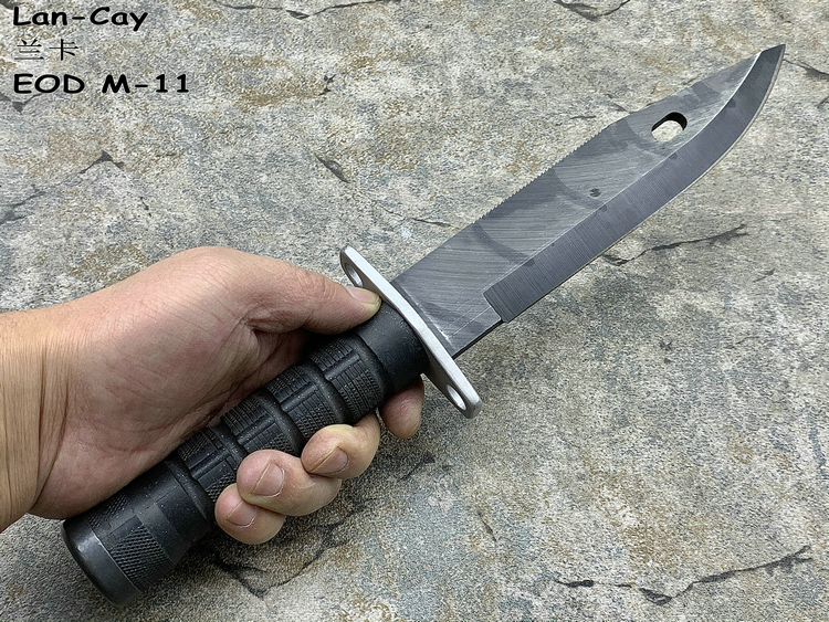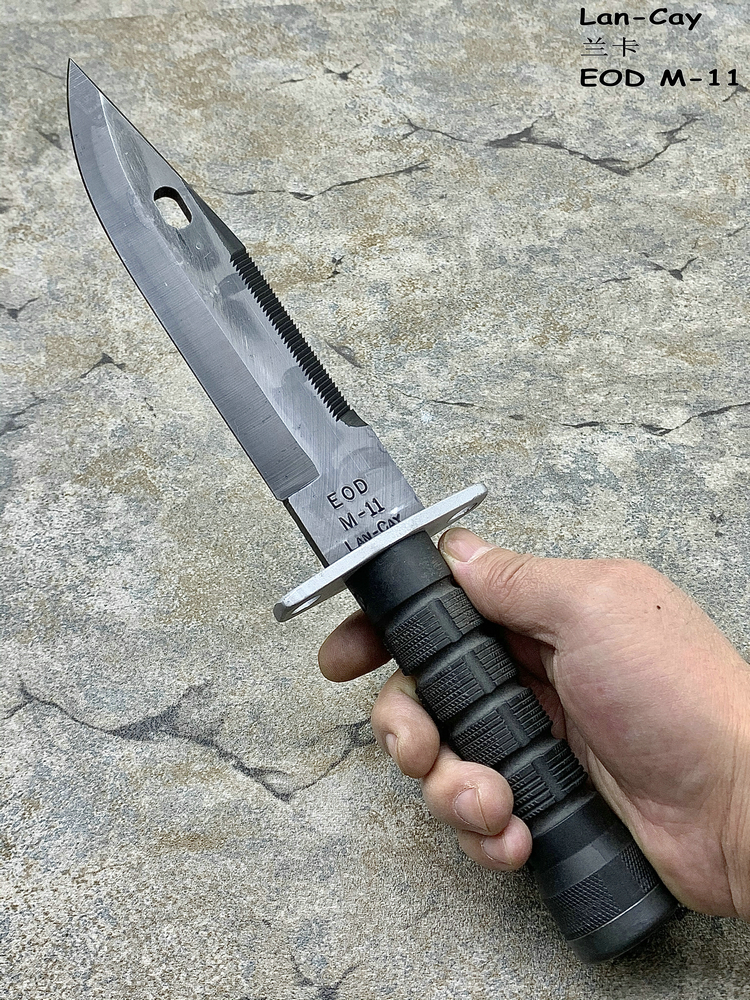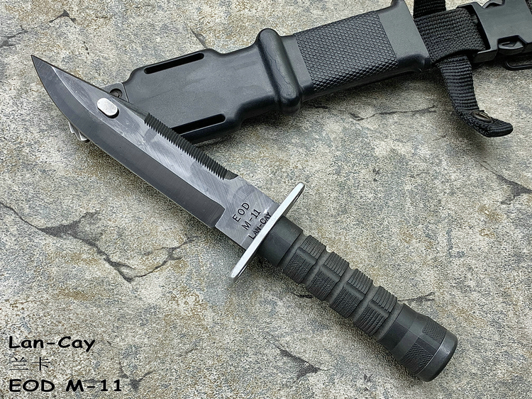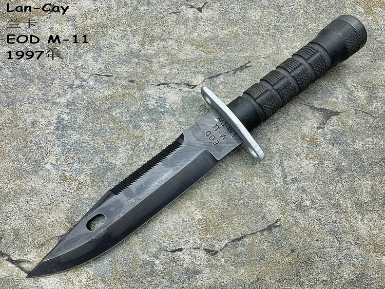 Lan-Cay 兰卡 EOD M-111997年:Lan-cay Inc应美陆军第52兵工群(52nd Ordnance Group)于是1996年之计划需求,根据M9刺刀为蓝图设计,小部分修改后经美陆军定制式为M11 EOD专用刀,供其EOD(Explosive Ordnance Disposal)炸药处理单位使用。M11式EOD刀第一批合约于1997年由Lan-cay Inc·承制,首批EOD刀为OD橄榄绿色,经驻于前南斯拉夫的波士尼亚及科威特的美军实地验证使用后,M11式EOD刀之标准颜色则改为黑色(原有OD色之工具包,经改进设计及增强材质后亦改为黑色)。刀身注记:EOD M11 LAN-CAY。