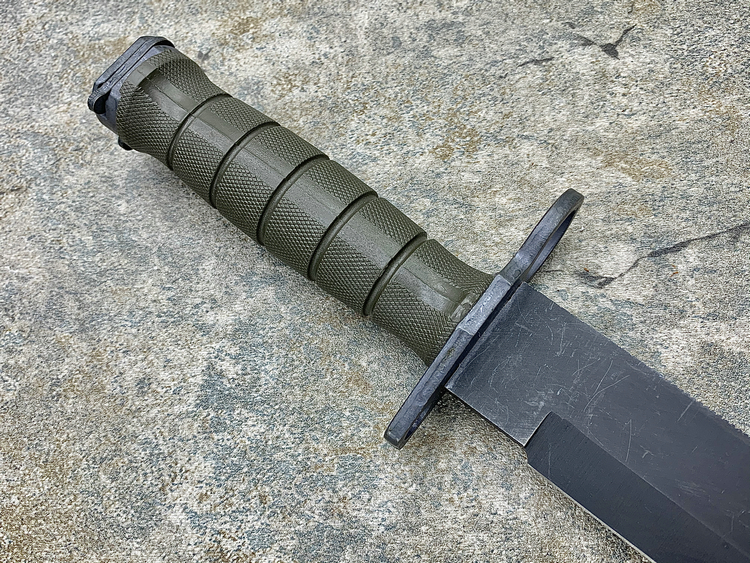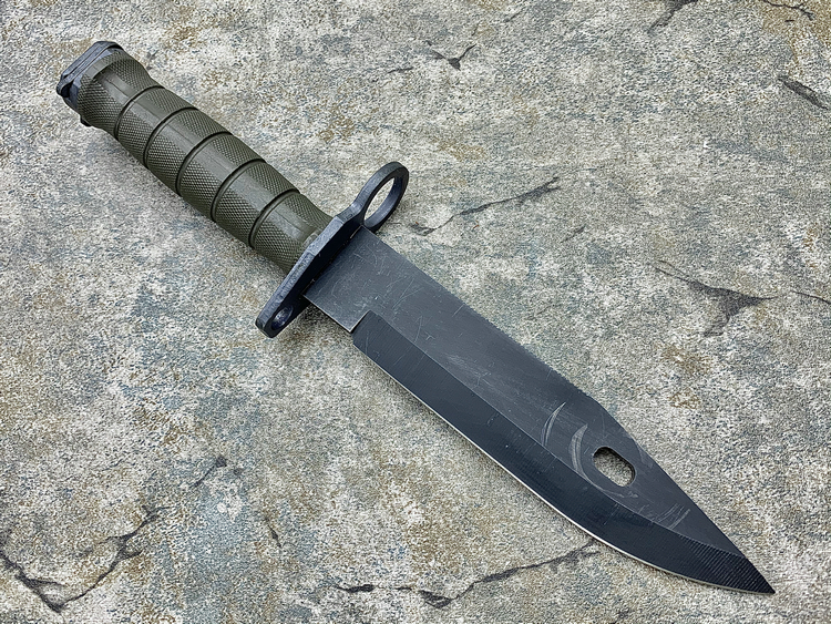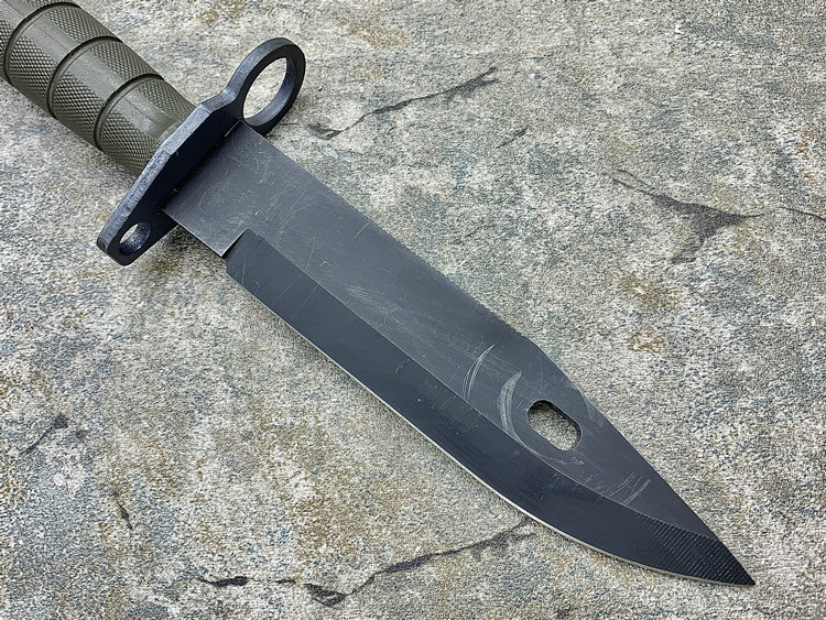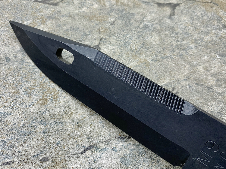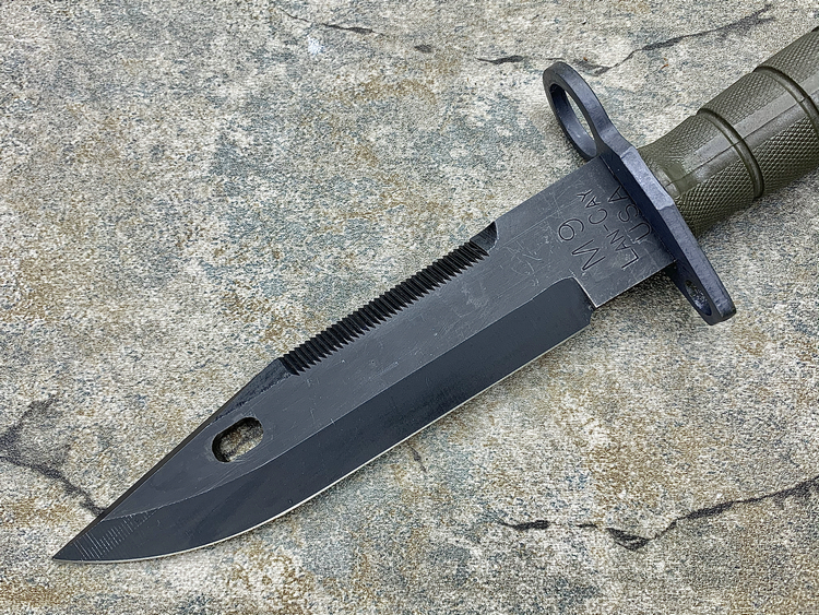 M9刺刀刀身用不锈钢锻压制成,与刀柄芯杆通过螺纹连接。刀身表面呈浅灰色,刃口部位经局部热处理,锋利无比。刀背上的扁孔套在刀鞘上的驻笋上并与之紧密配合,能剪断直径0.25in(6.35mm)铁皮箍或肋状钢丝网。刀背上的锯齿和锉齿坚硬而锋利,可锯穿飞机壳体,能锯断2in(50.8mm)厚的松木板和直径1in(25.4mm)的硬木棒。